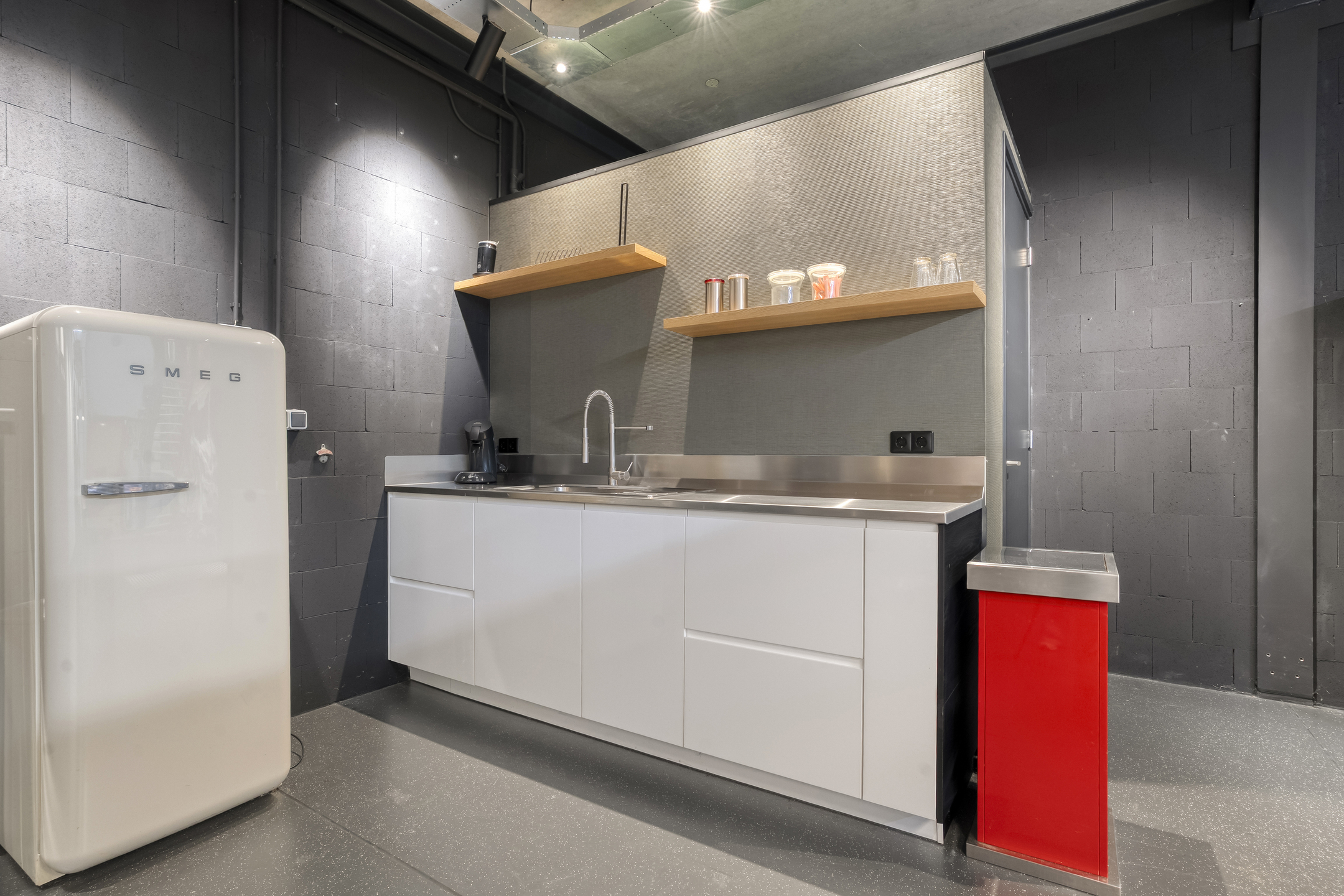 - keukenblok met vaatwasser, close in boiler en rode prullenbak;