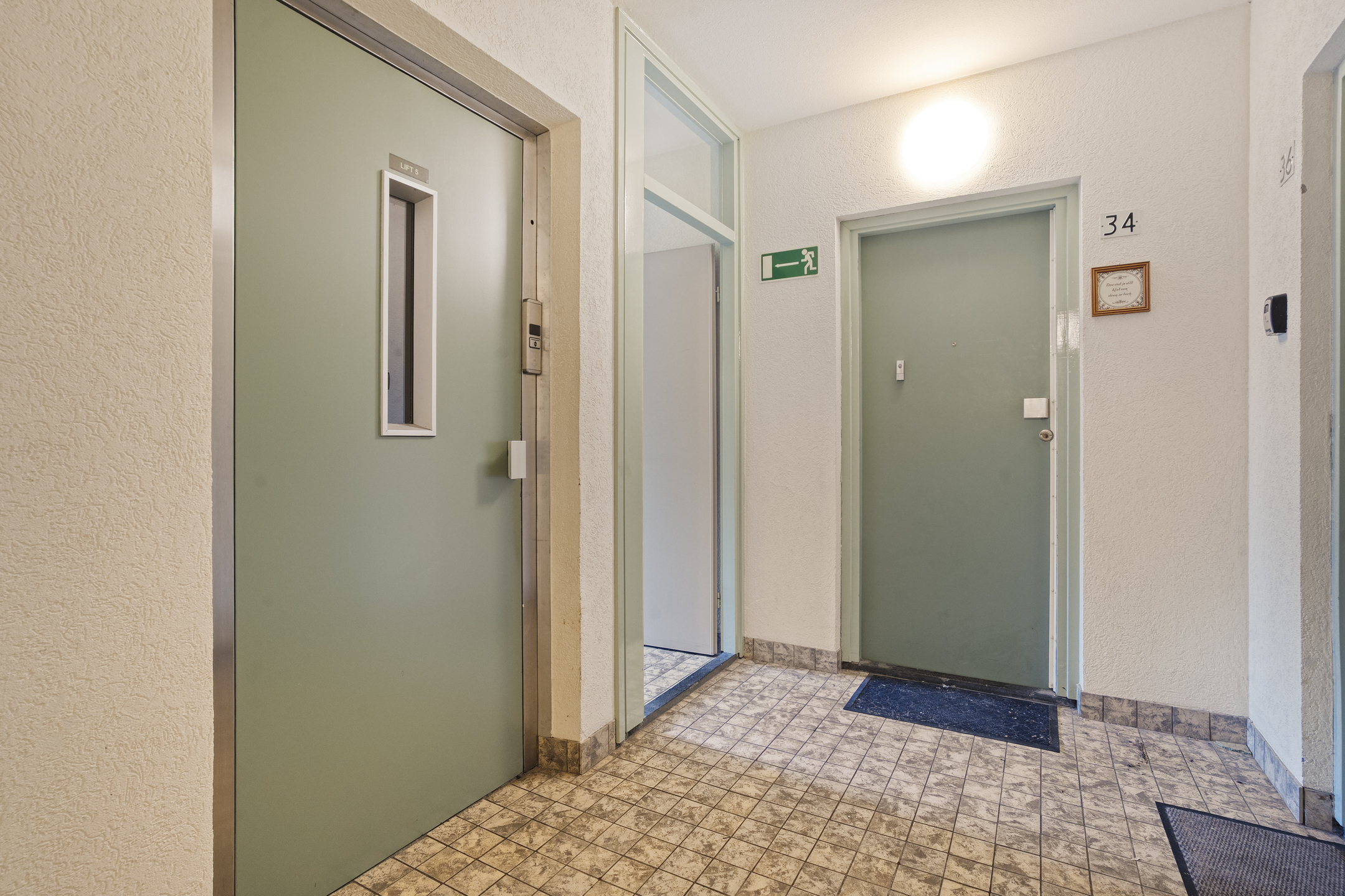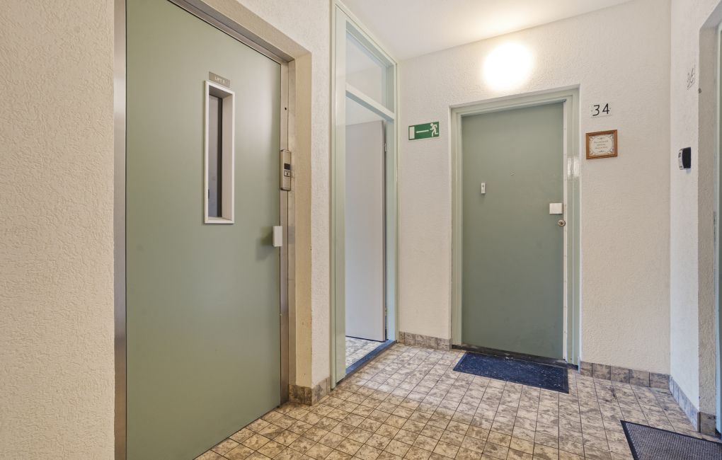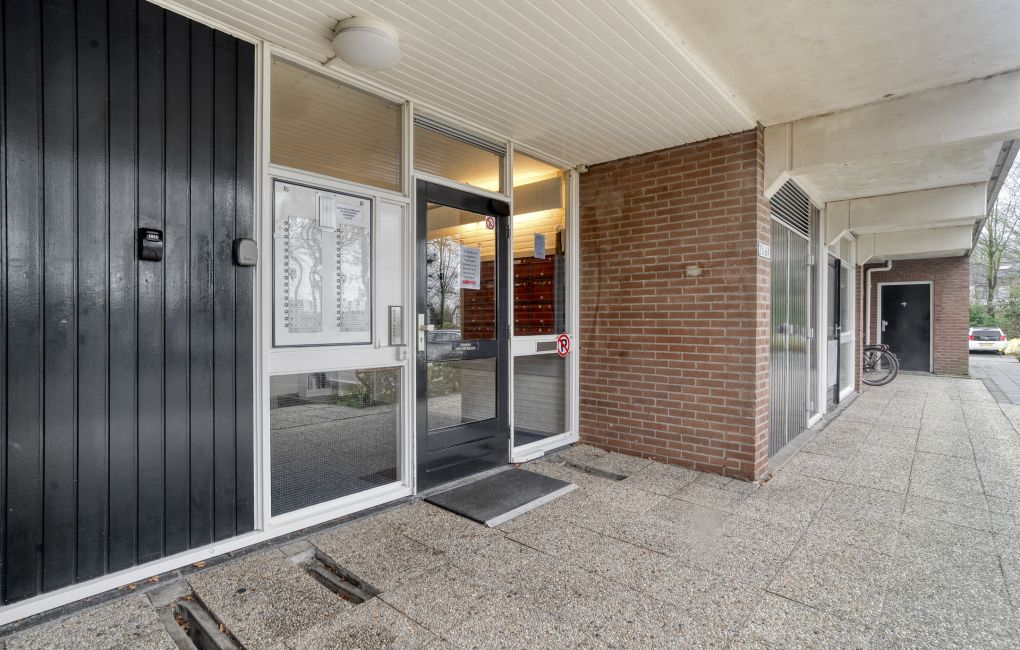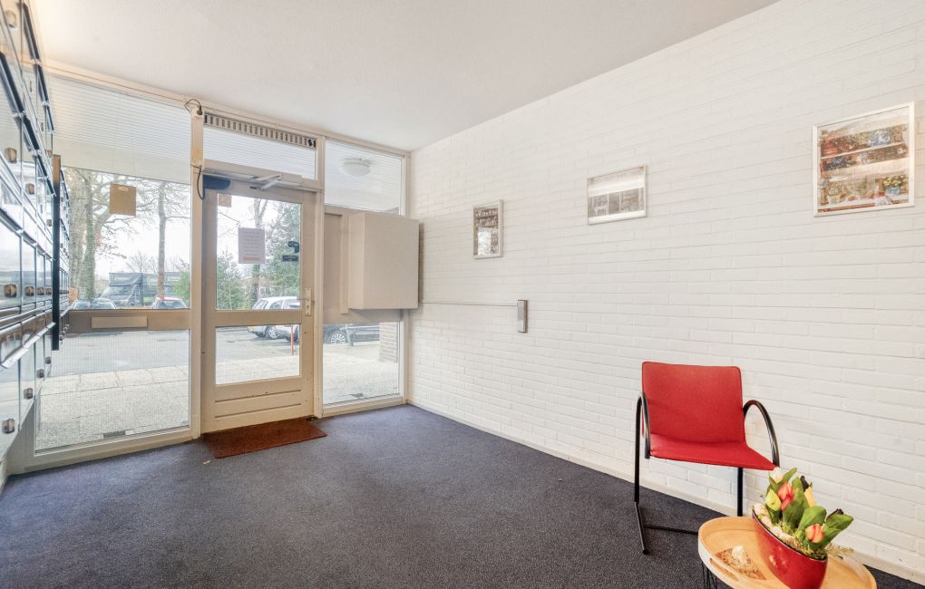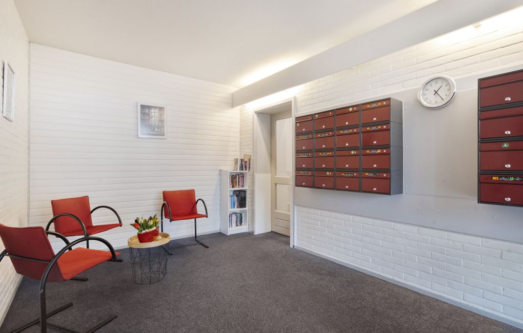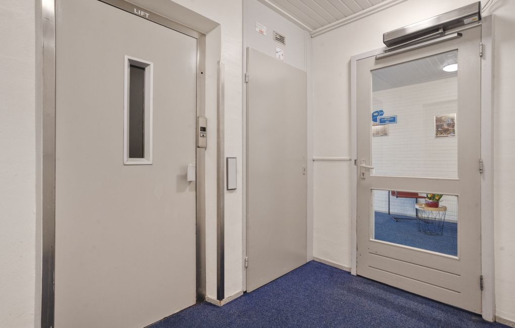 Je komt het appartementencomplex binnen via een nette centrale entree met intercom en brievenbussen. Vanuit hier neem je de lift of de trap naar de vijfde verdieping, waar het appartement zich bevindt.
