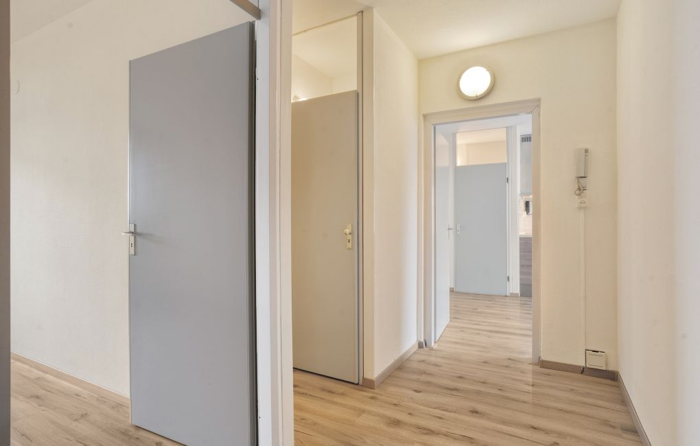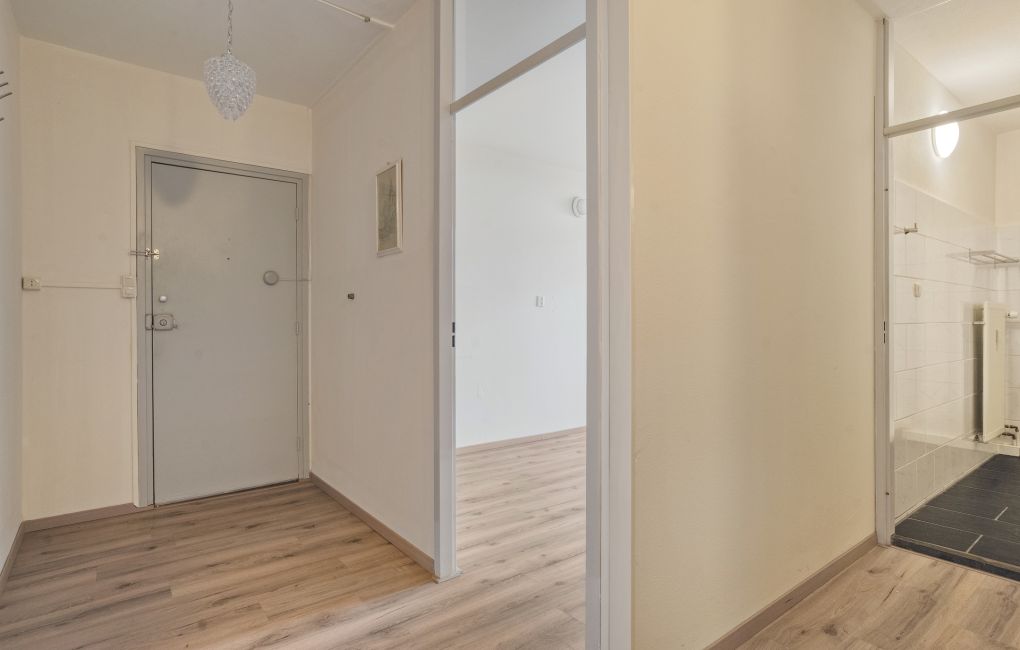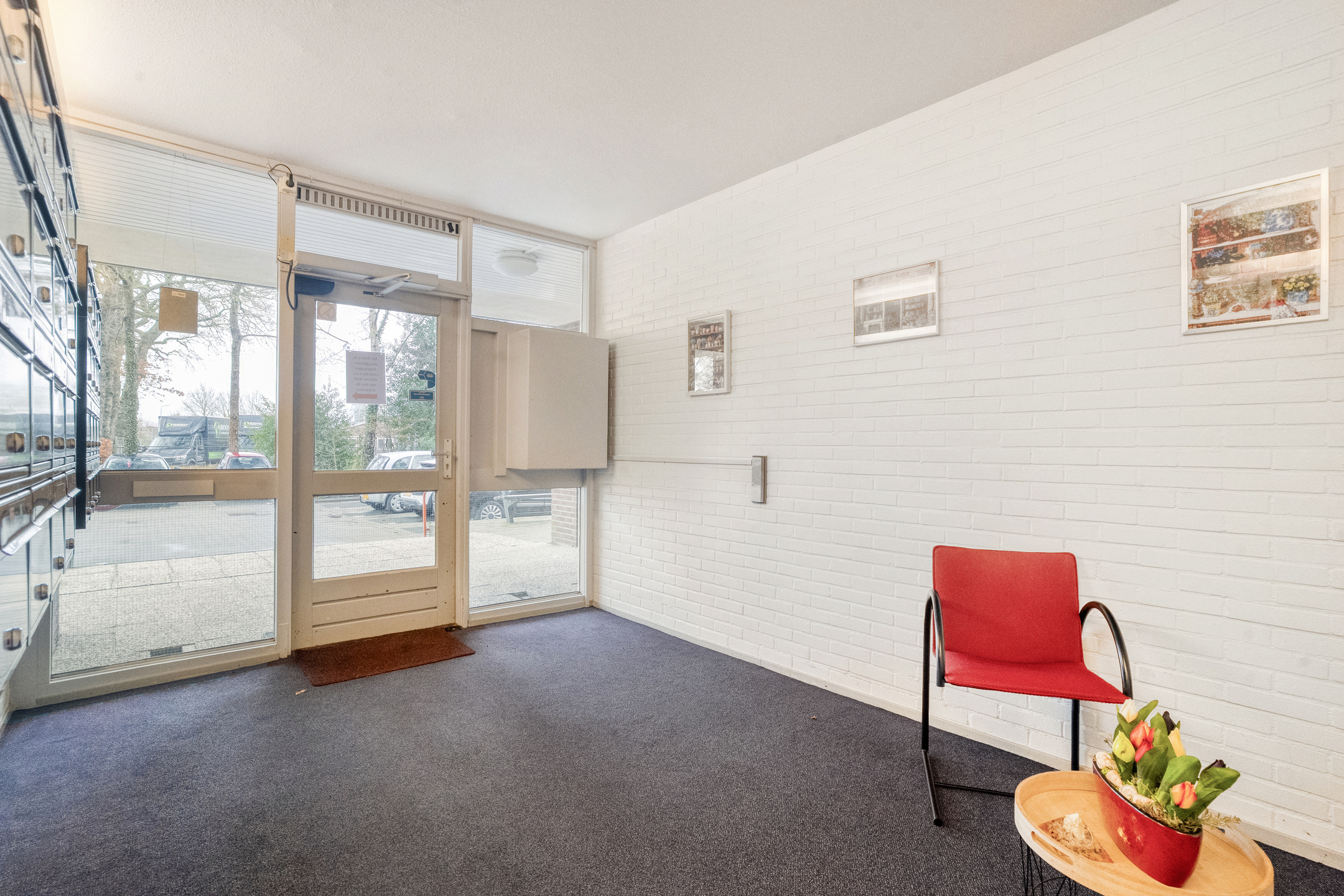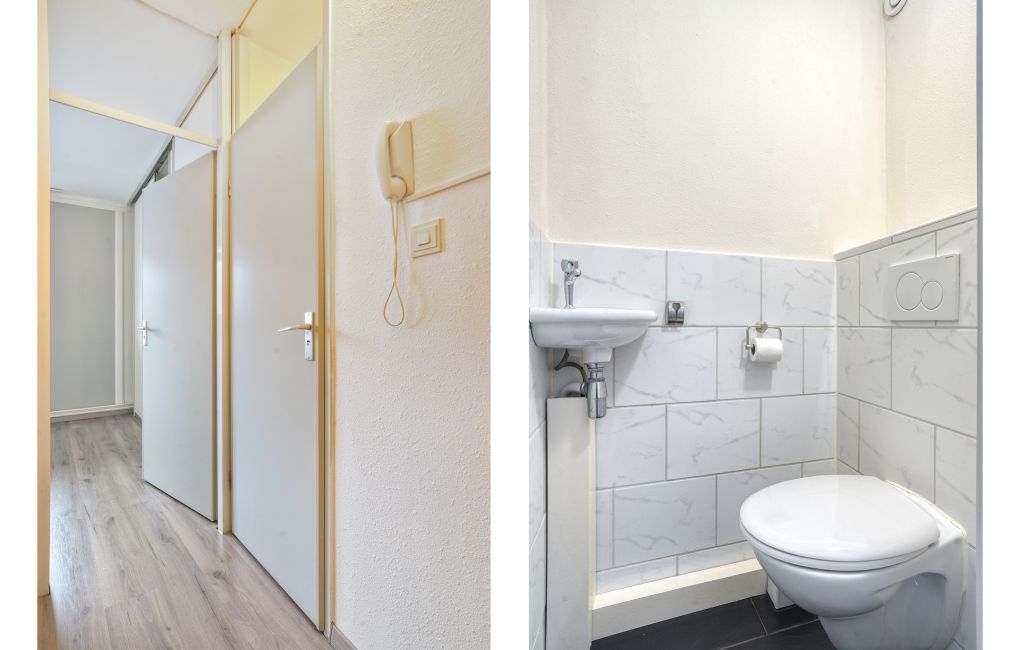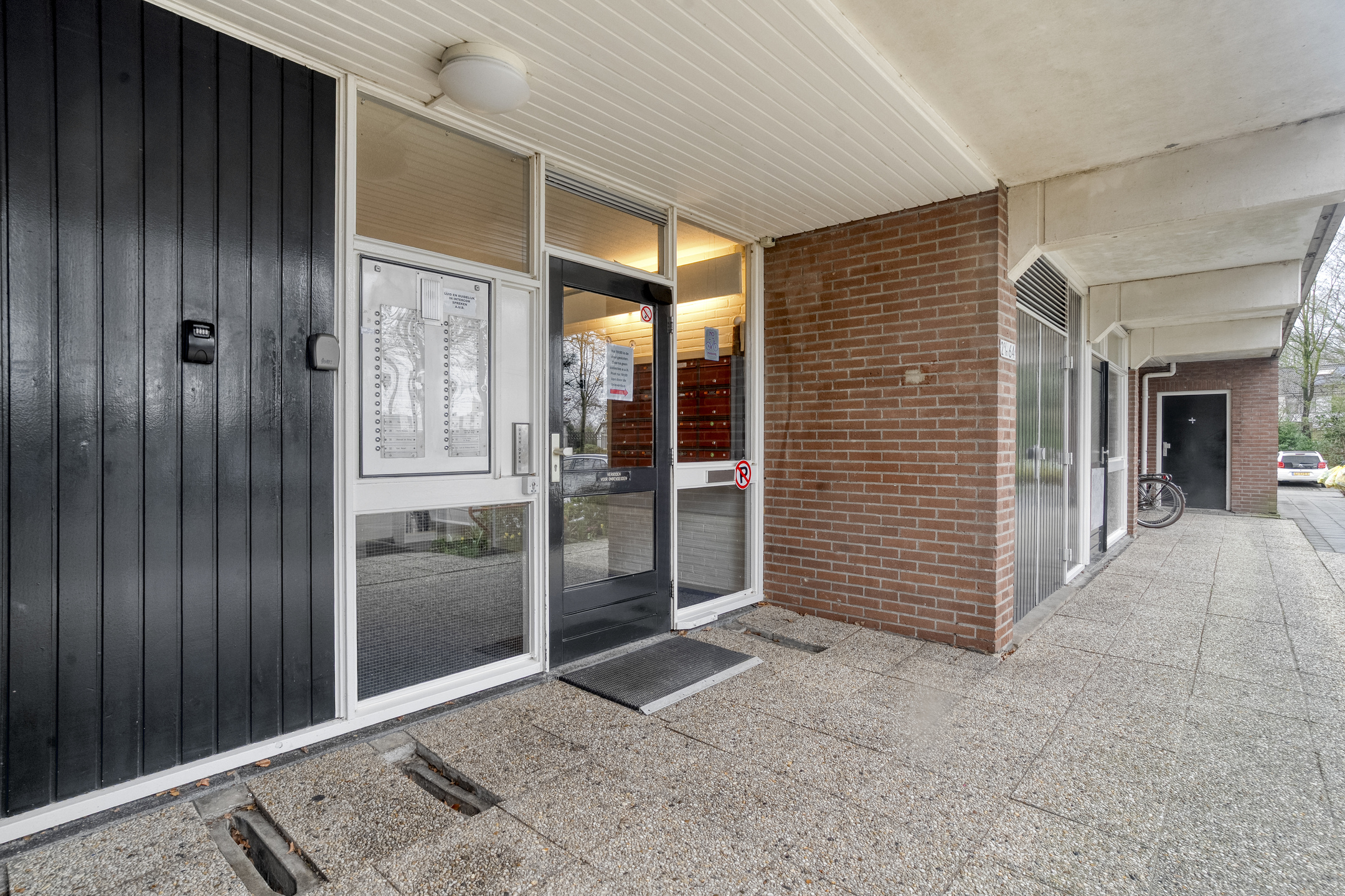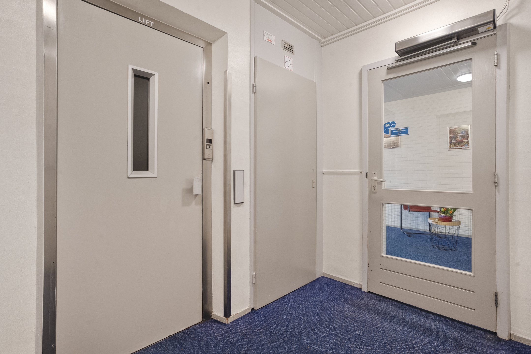 Je komt het appartementencomplex binnen via een nette centrale entree met intercom en brievenbussen. Vanuit hier neem je de lift of de trap naar de vijfde verdieping, waar het appartement zich bevindt.