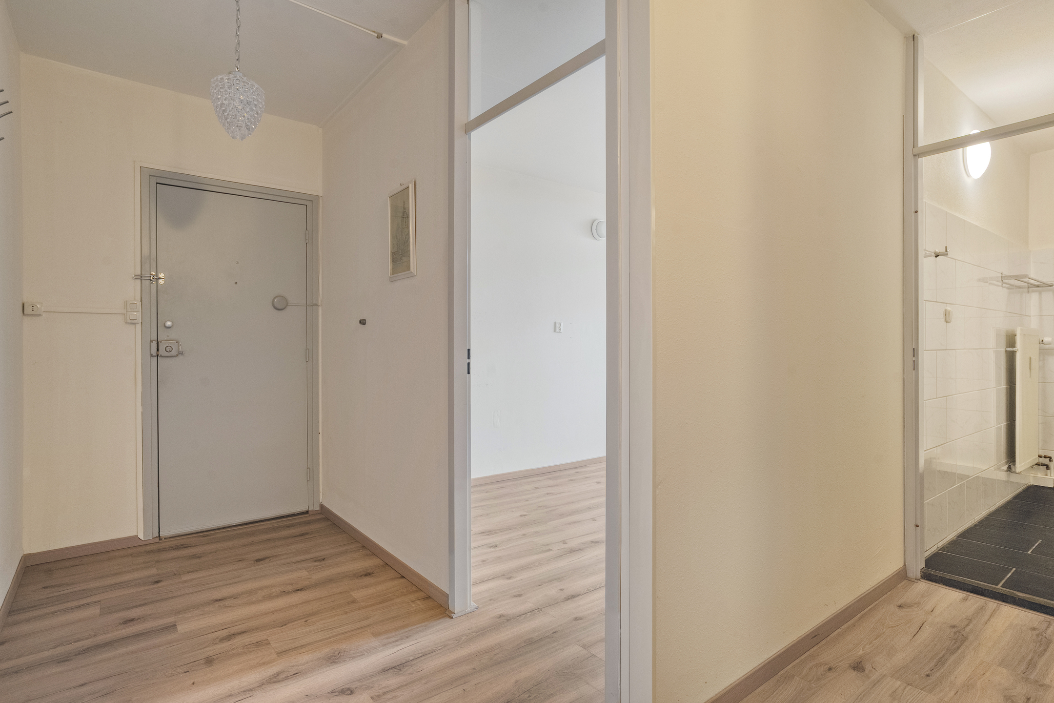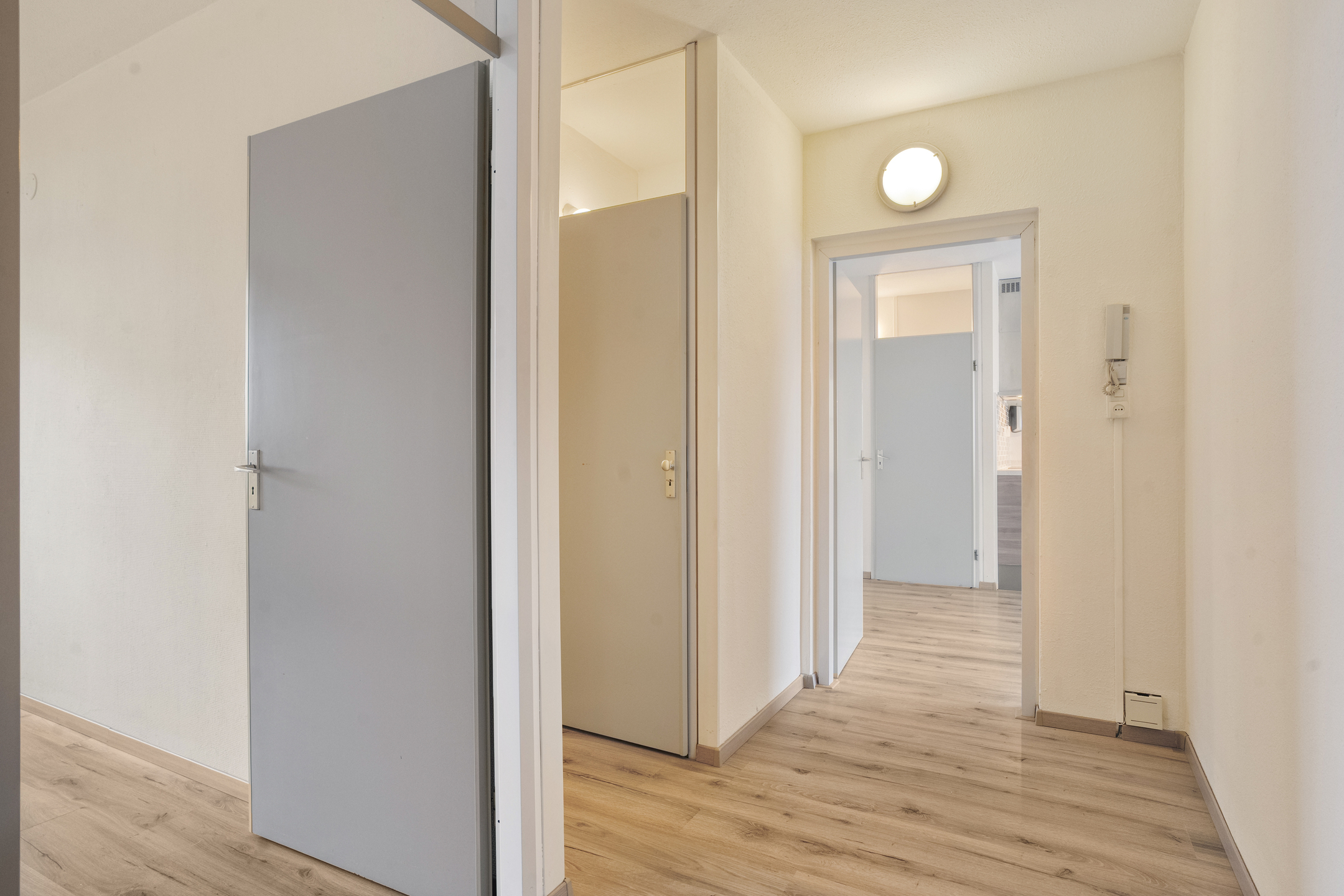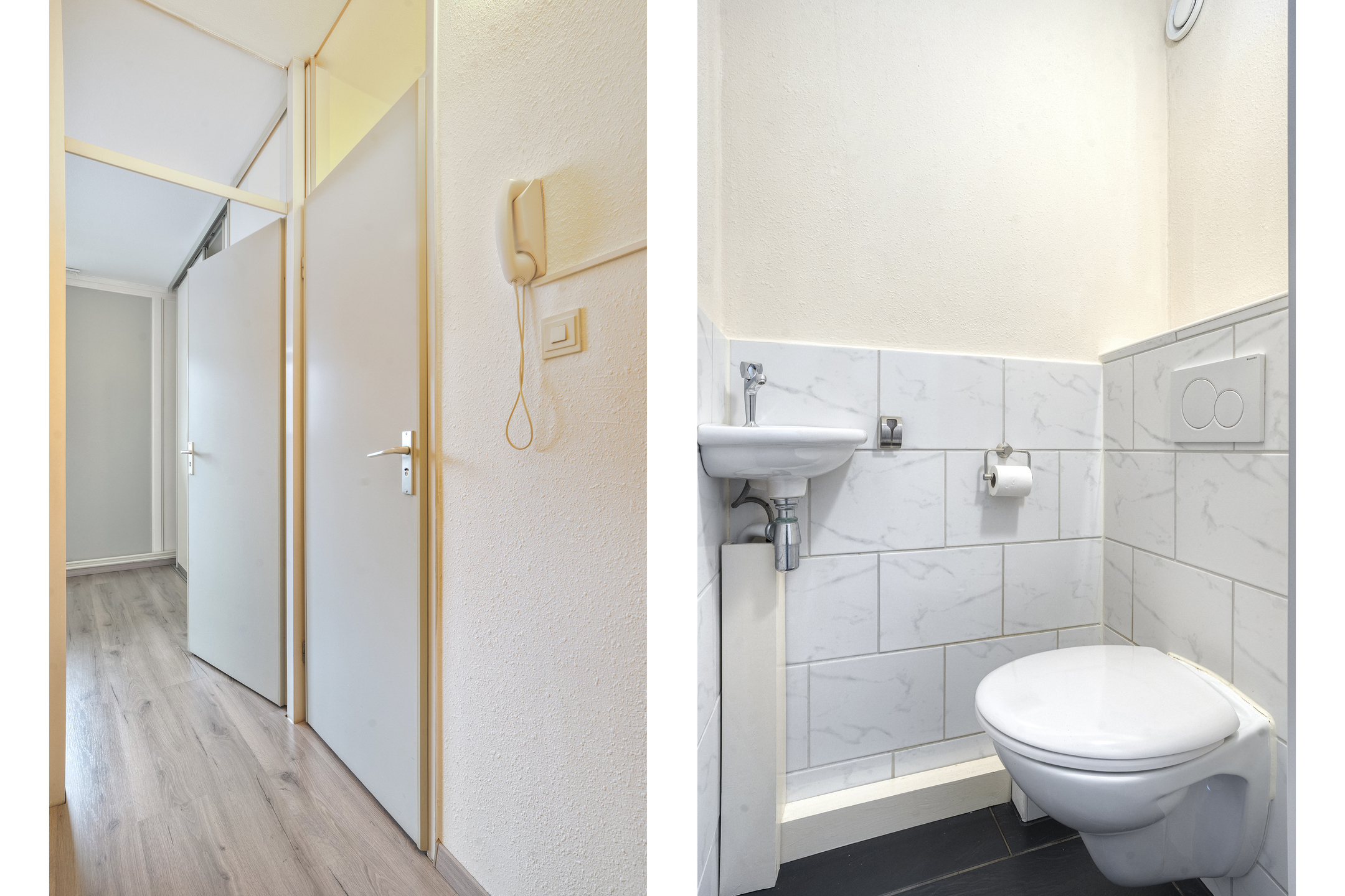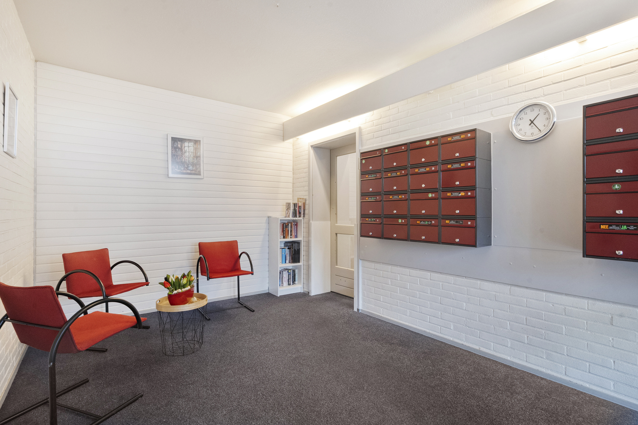 Je komt het appartementencomplex binnen via een nette centrale entree met intercom en brievenbussen. Vanuit hier neem je de lift of de trap naar de vijfde verdieping, waar het appartement zich bevindt.