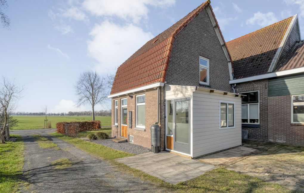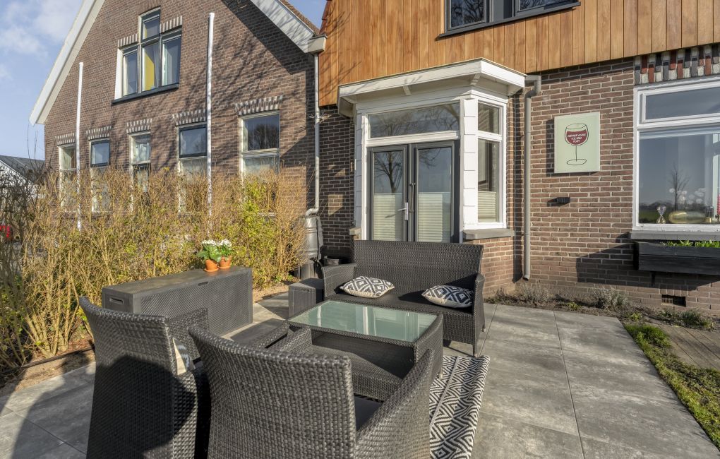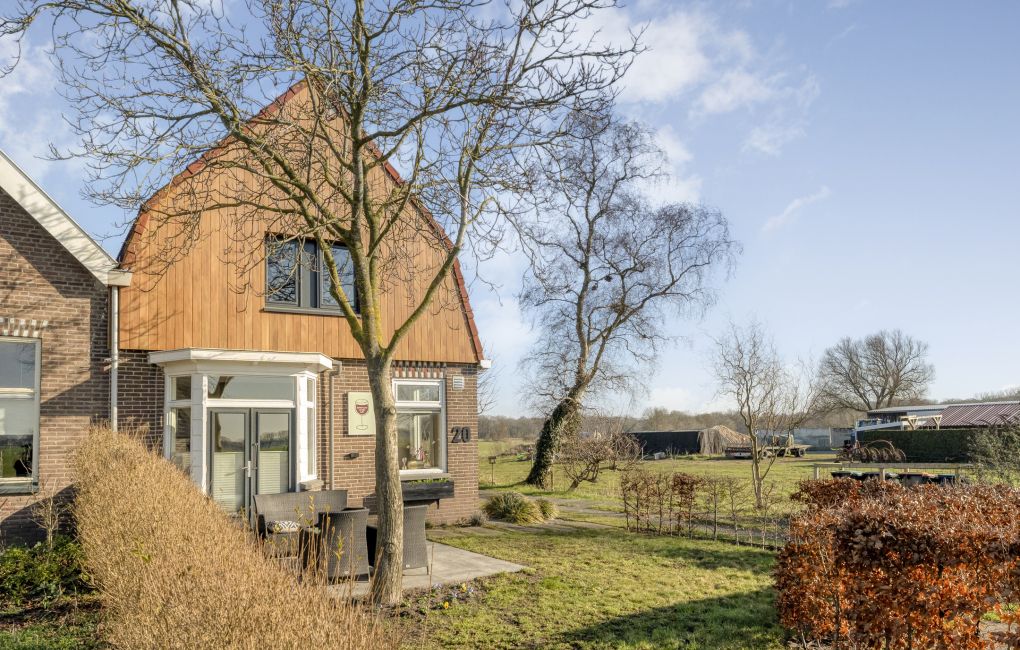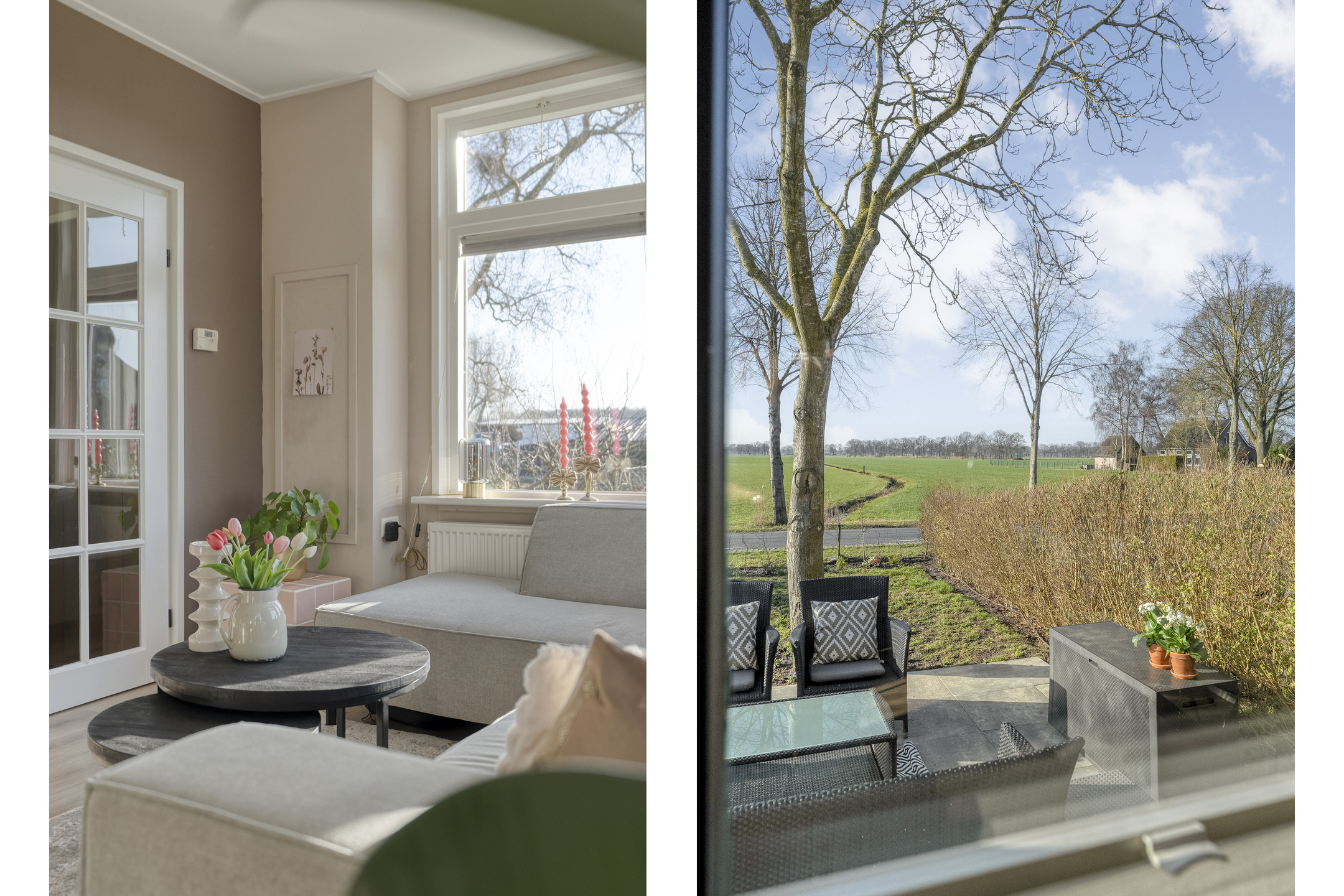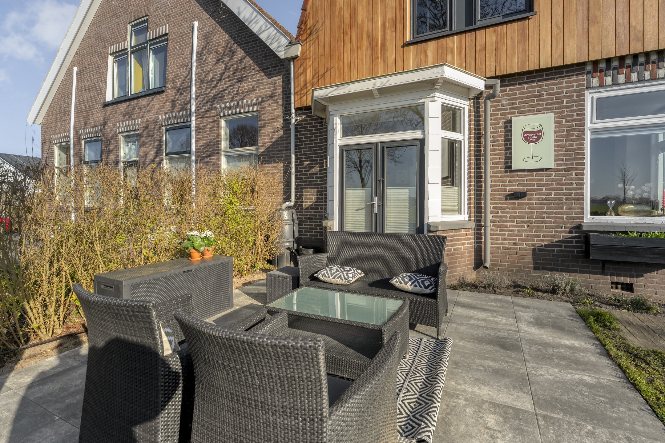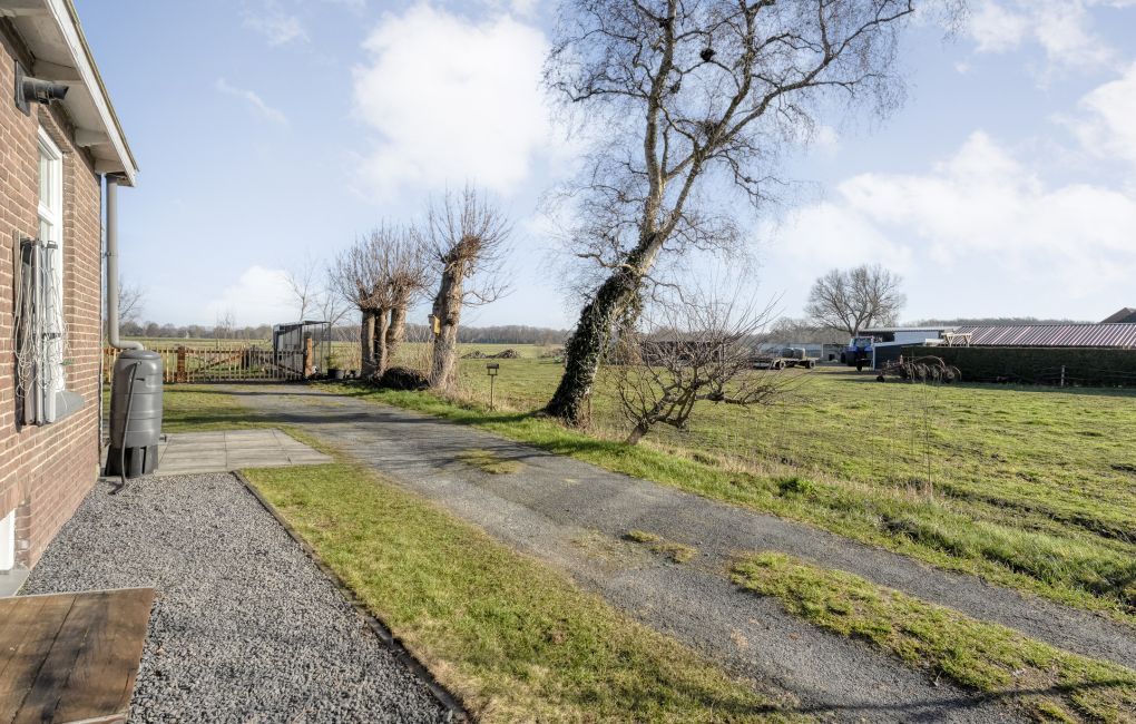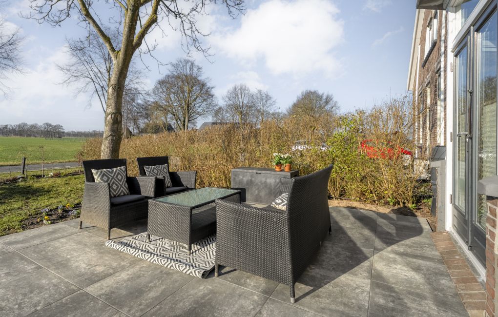 De voortuin is ingericht met een ruim terras waar je heerlijk buiten kunt zitten. De walnotenboom en beukenhaag geven de tuin een groene en sfeervolle uitstraling. Het vrije uitzicht over de landerijen maakt het plaatje compleet en zorgt ervoor dat je hier elke dag kunt genieten van het buitenleven.