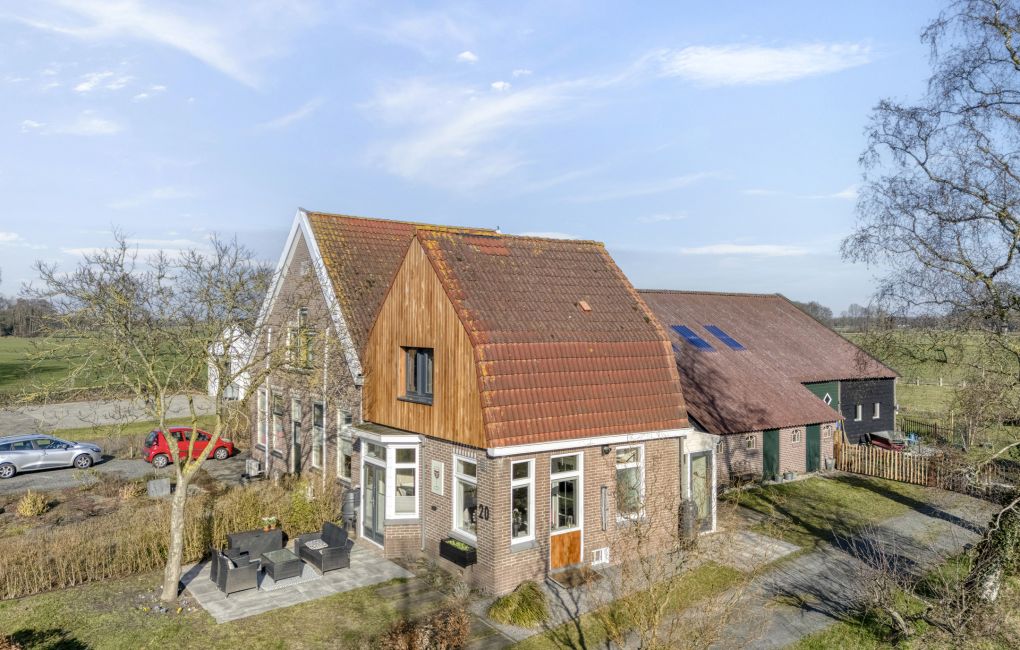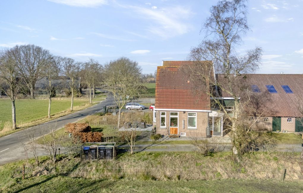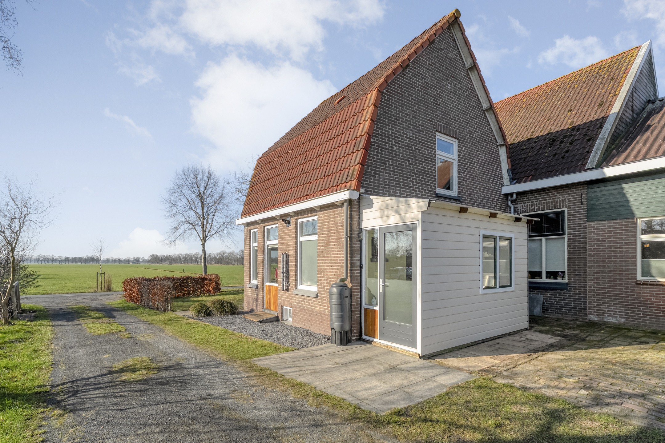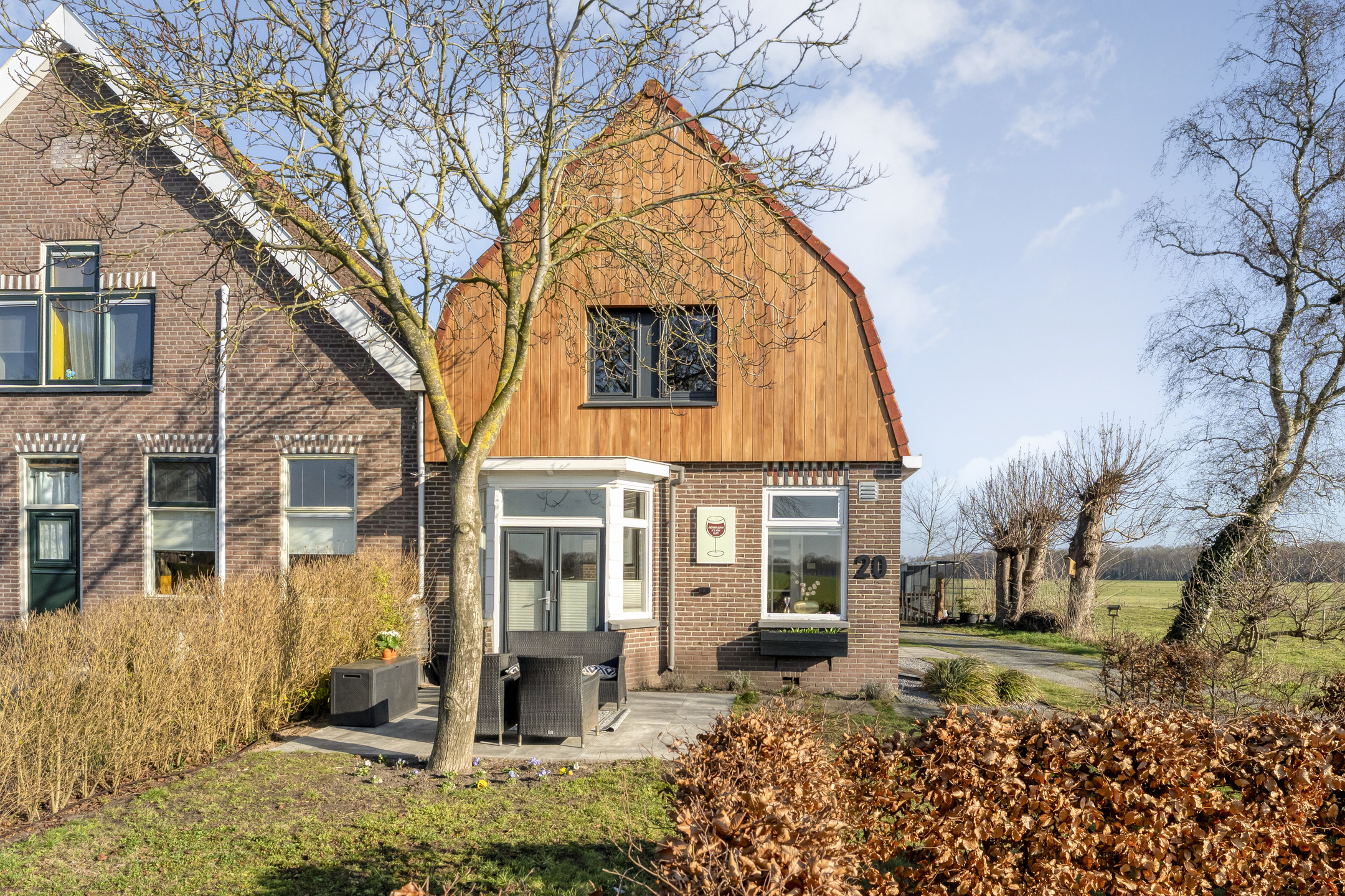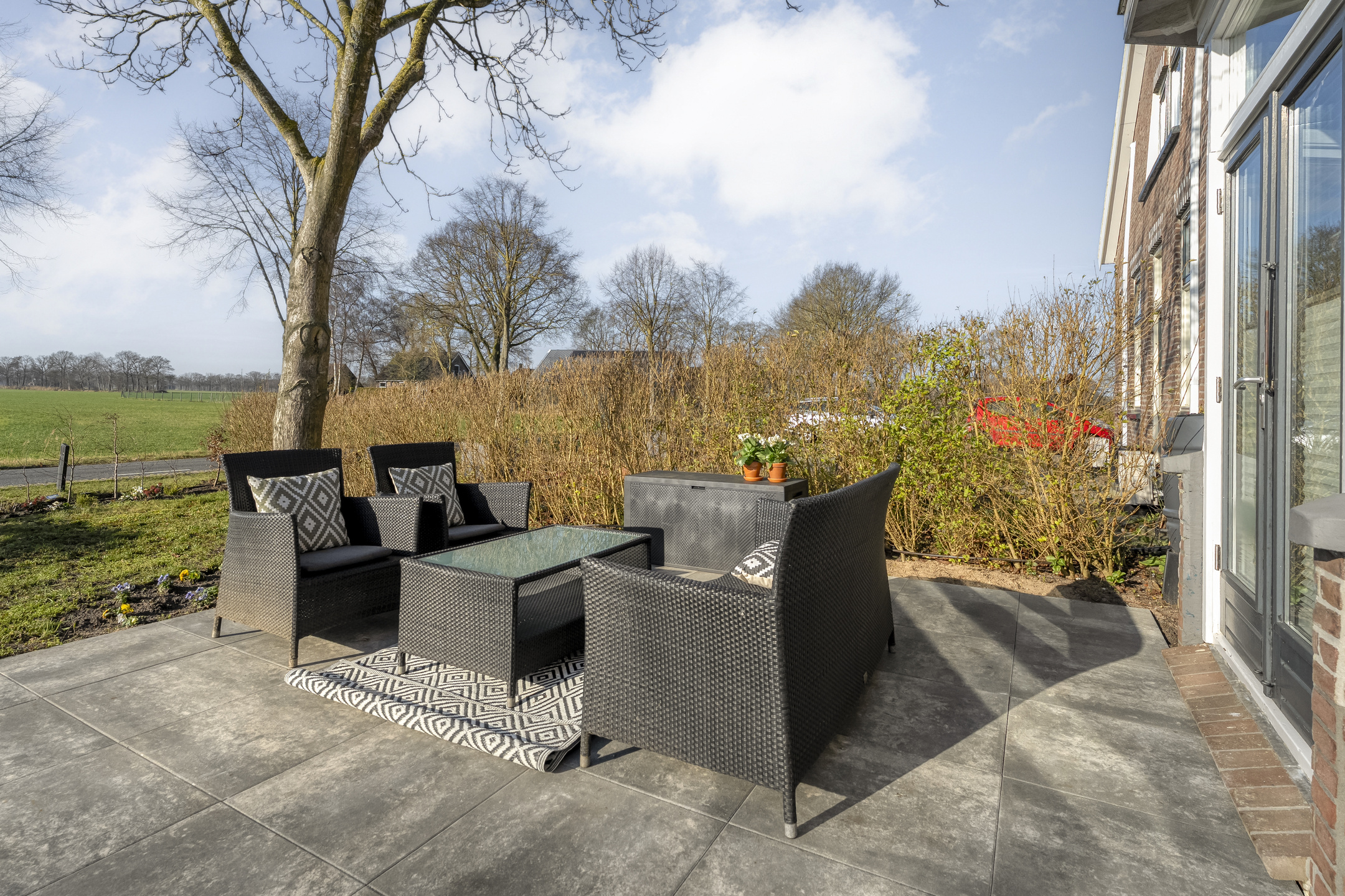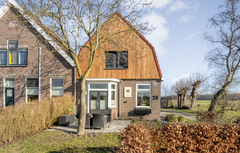 De voortuin is ingericht met een ruim terras waar je heerlijk buiten kunt zitten. De walnotenboom en beukenhaag geven de tuin een groene en sfeervolle uitstraling. Het vrije uitzicht over de landerijen maakt het plaatje compleet en zorgt ervoor dat je hier elke dag kunt genieten van het buitenleven.