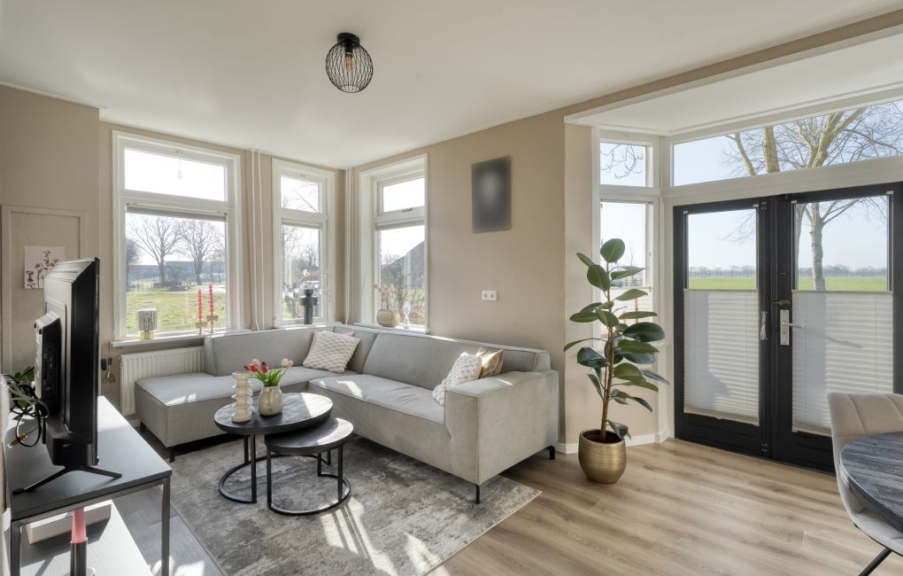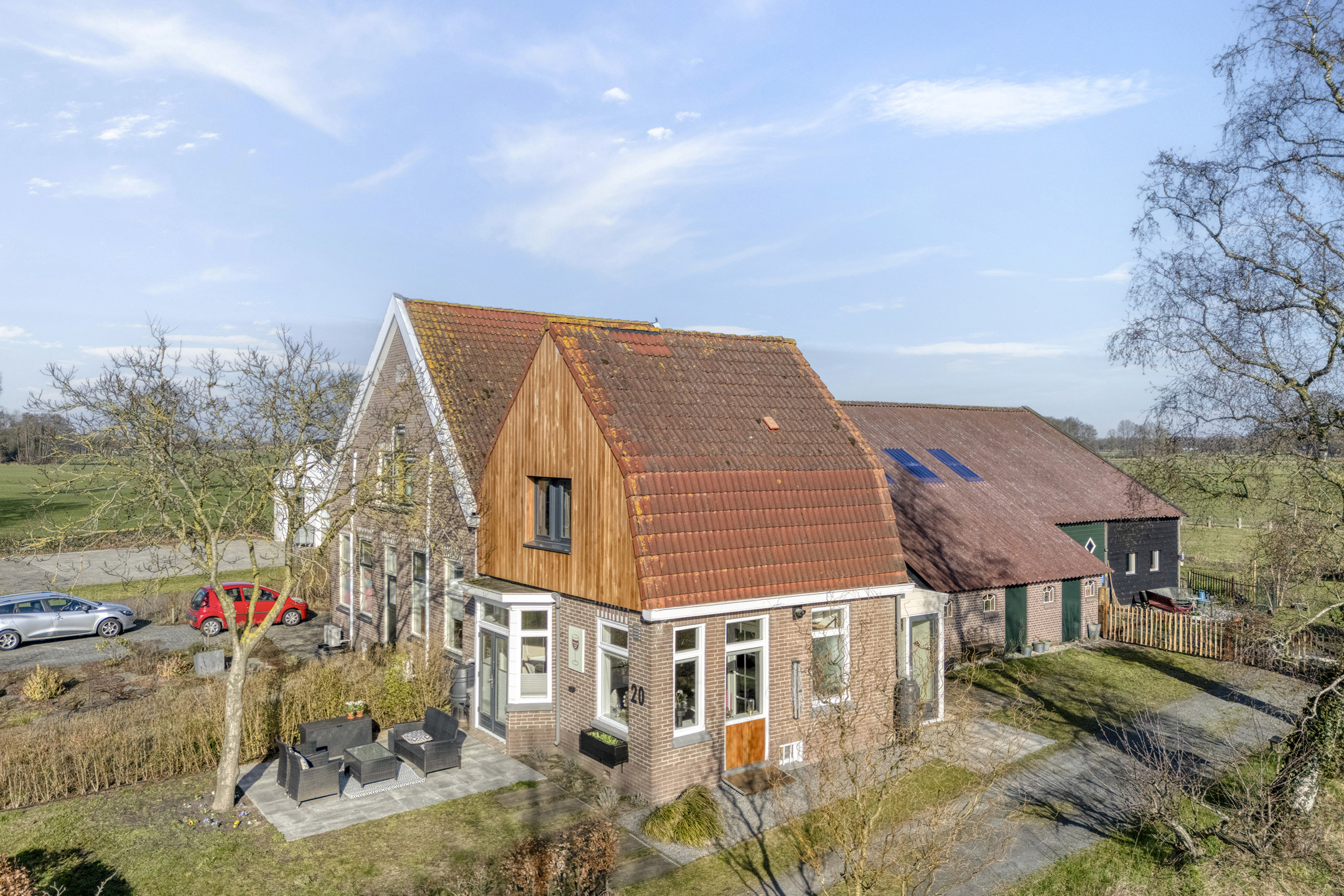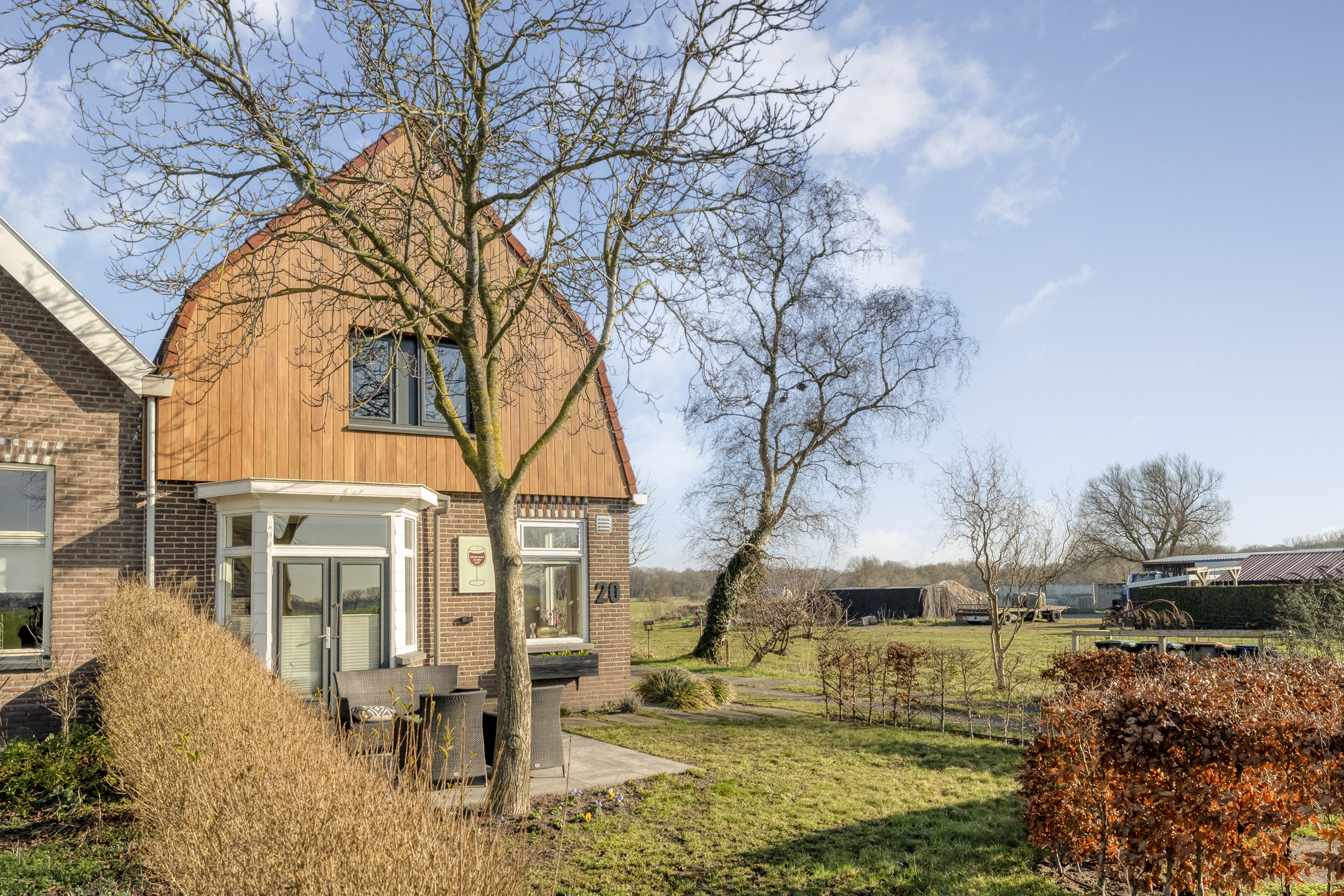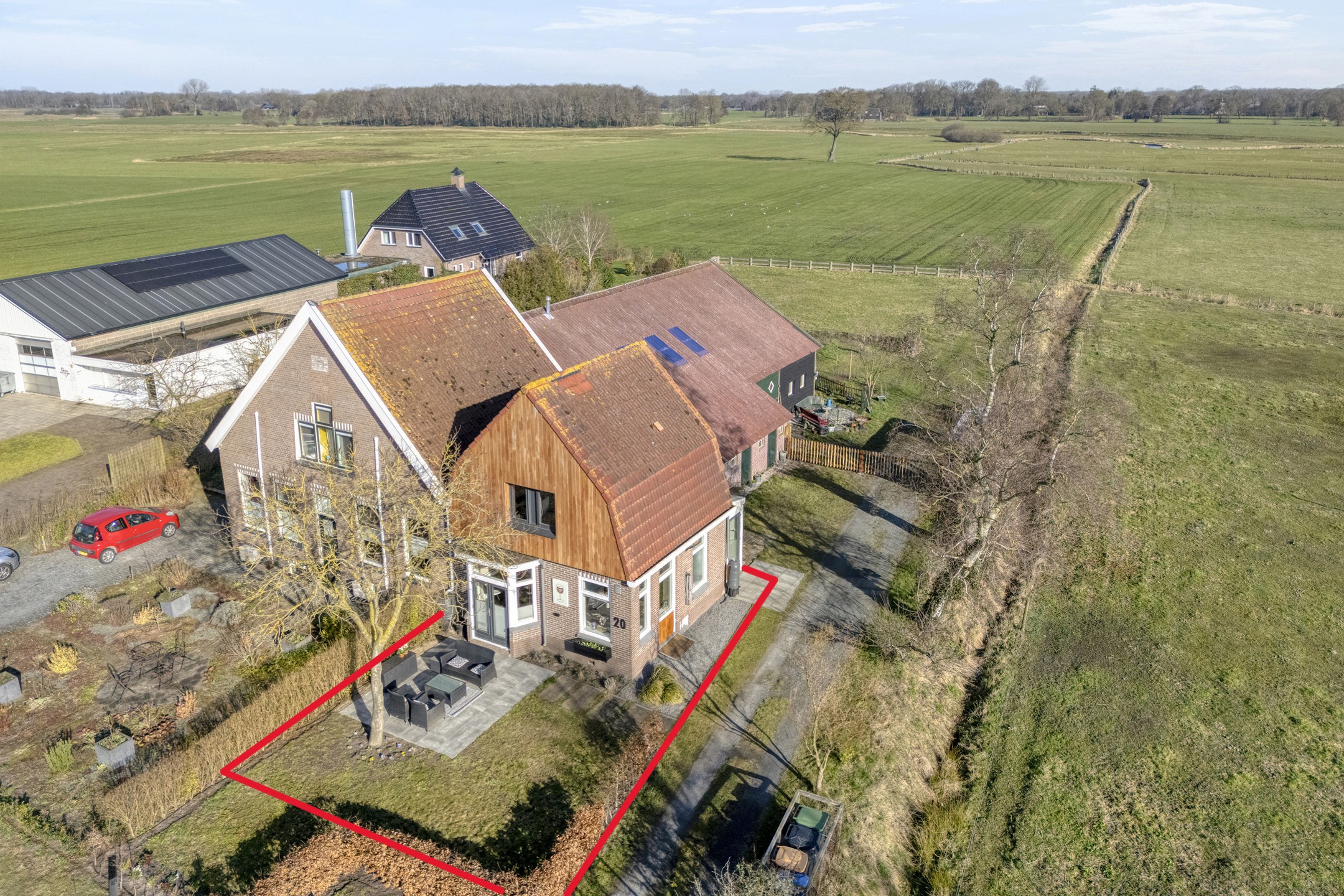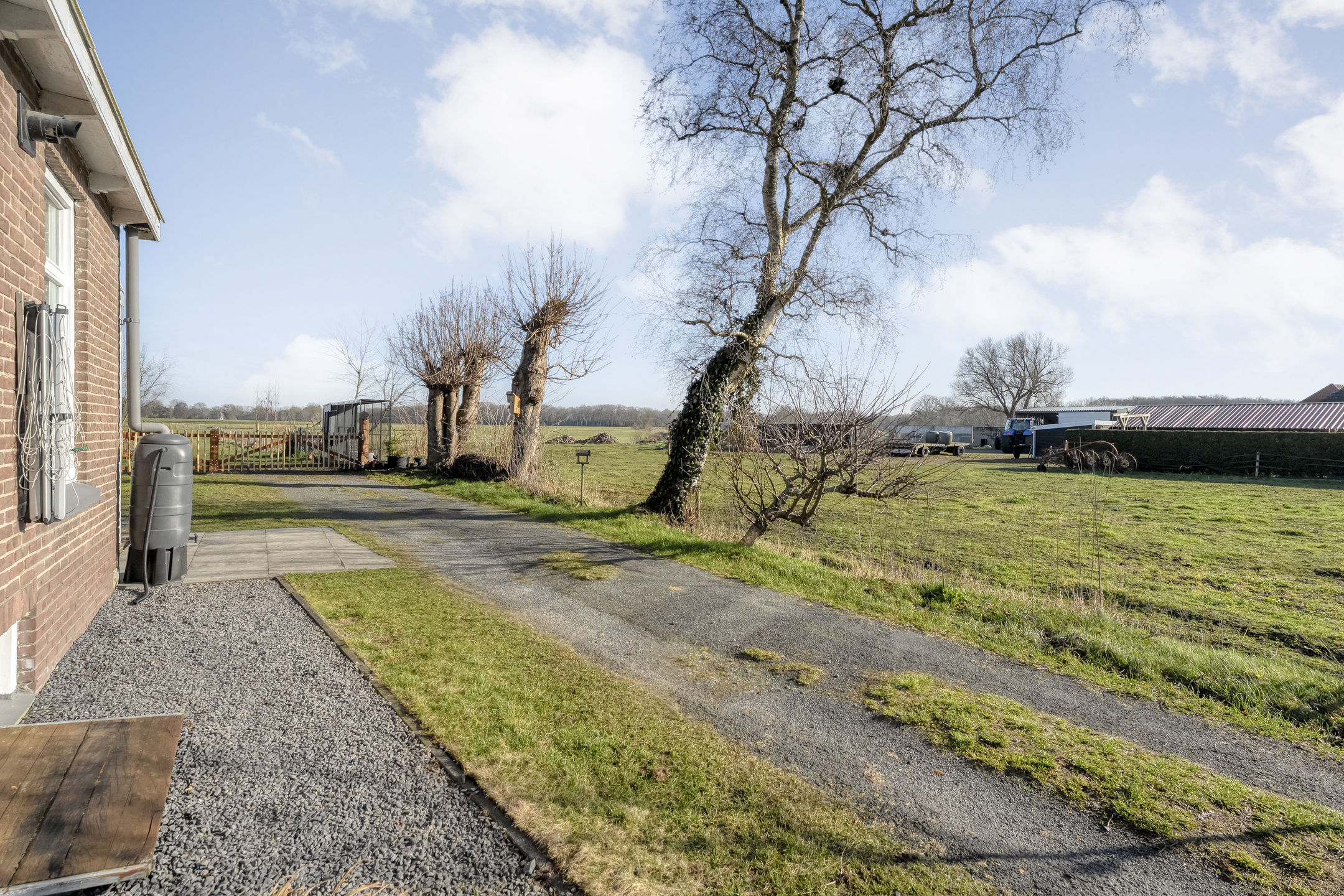 De voortuin is ingericht met een ruim terras waar je heerlijk buiten kunt zitten. De walnotenboom en beukenhaag geven de tuin een groene en sfeervolle uitstraling. Het vrije uitzicht over de landerijen maakt het plaatje compleet en zorgt ervoor dat je hier elke dag kunt genieten van het buitenleven.