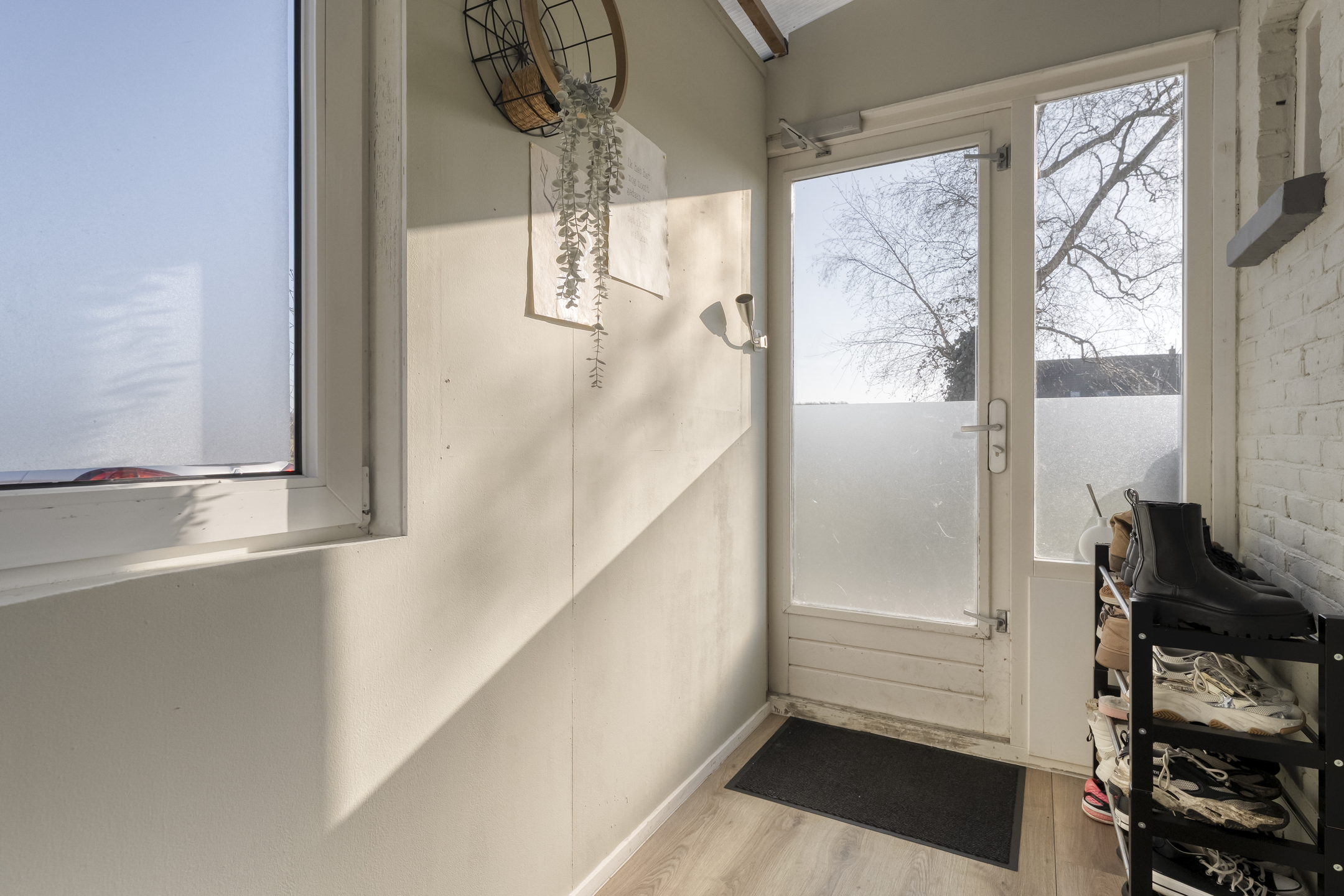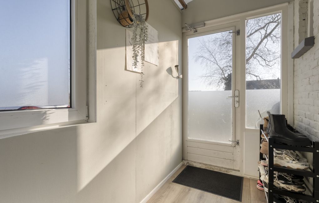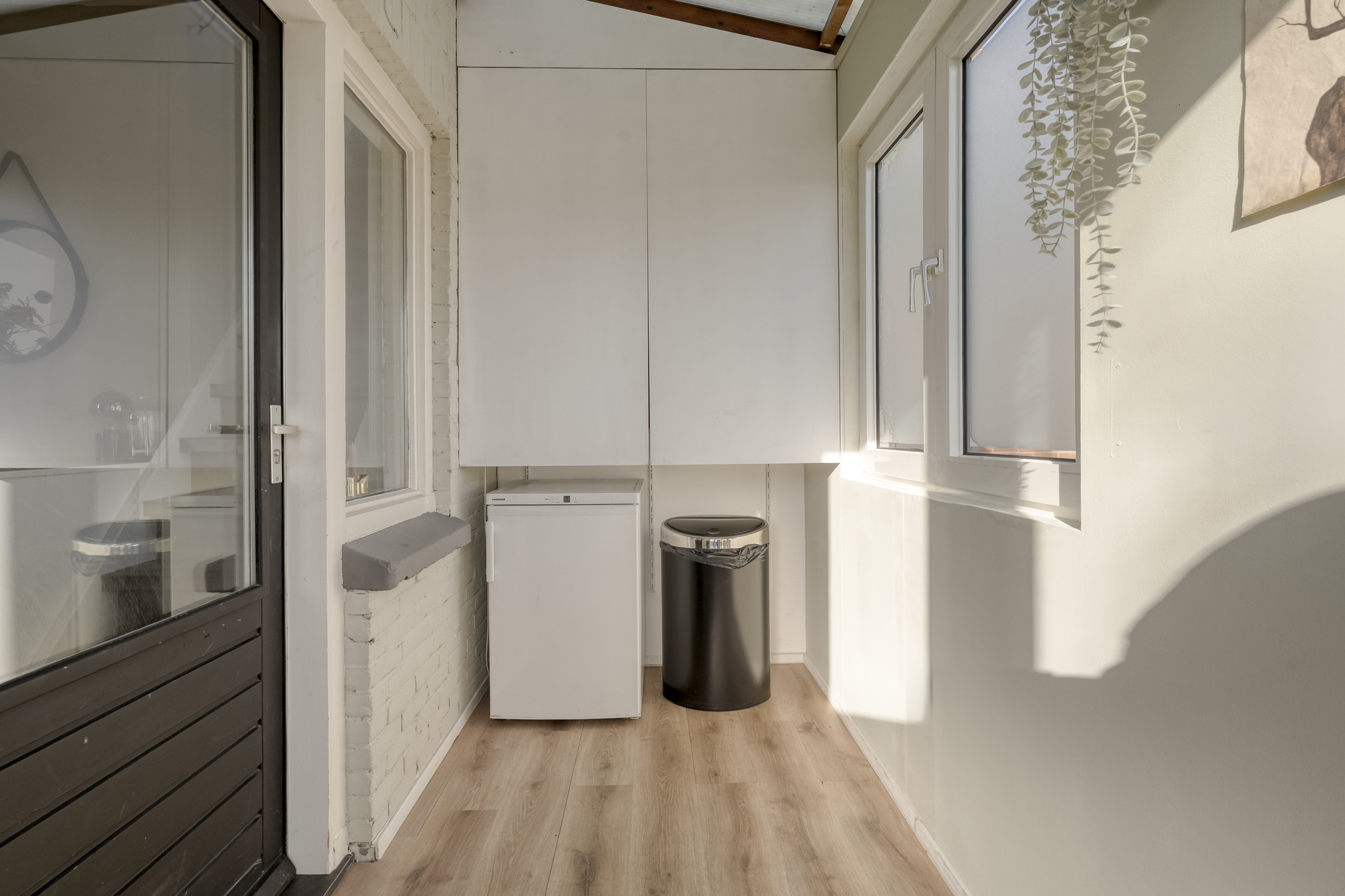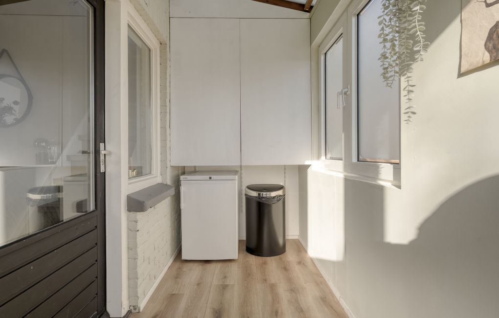 De aanbouw is voorzien van kunststof-gevelbeplating en is een praktische ruimte voor het bergen van bijvoorbeeld een fiets, een extra koelkast en dergelijke. Uiteraard functioneert het ook als tochtportaal naar de hal.