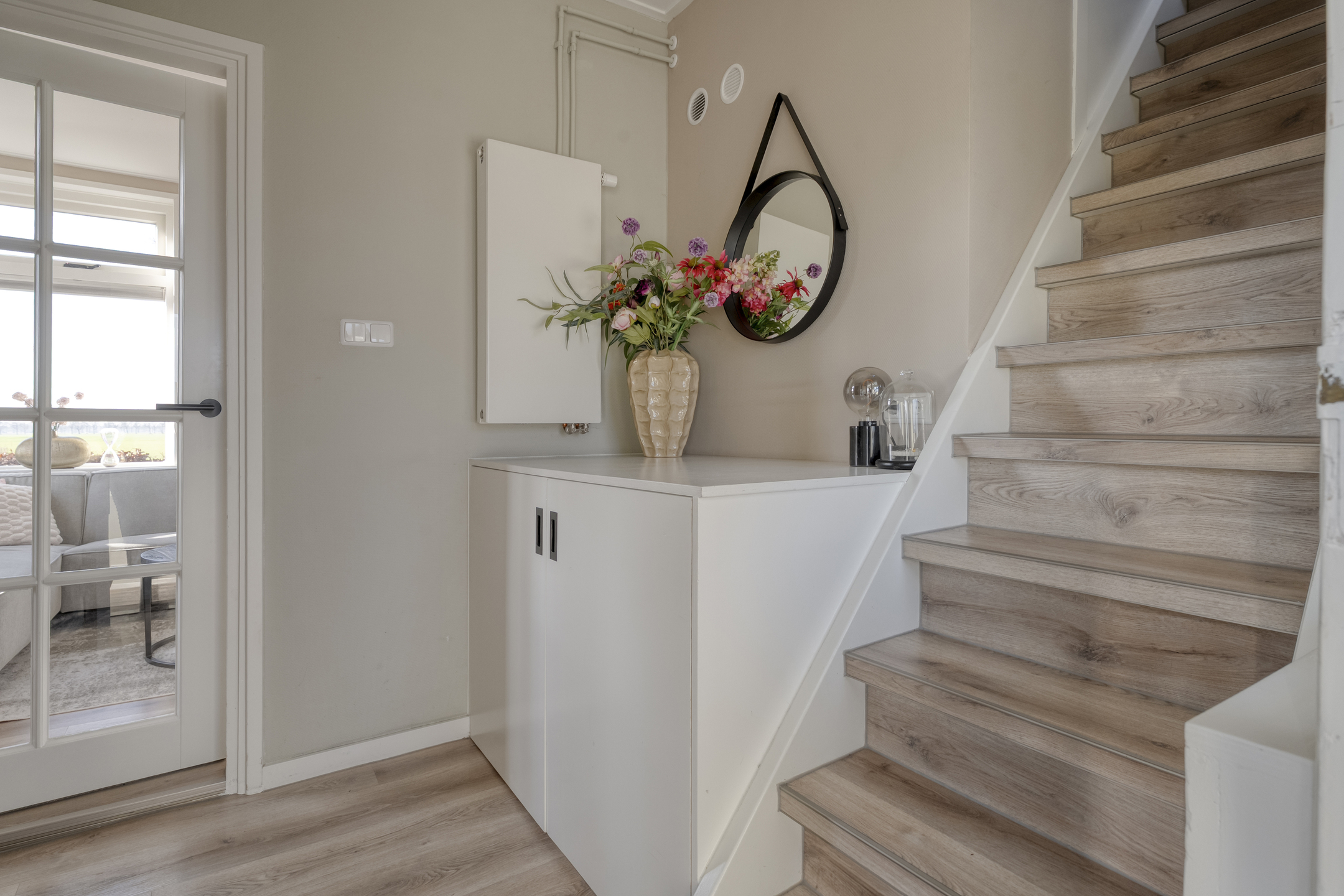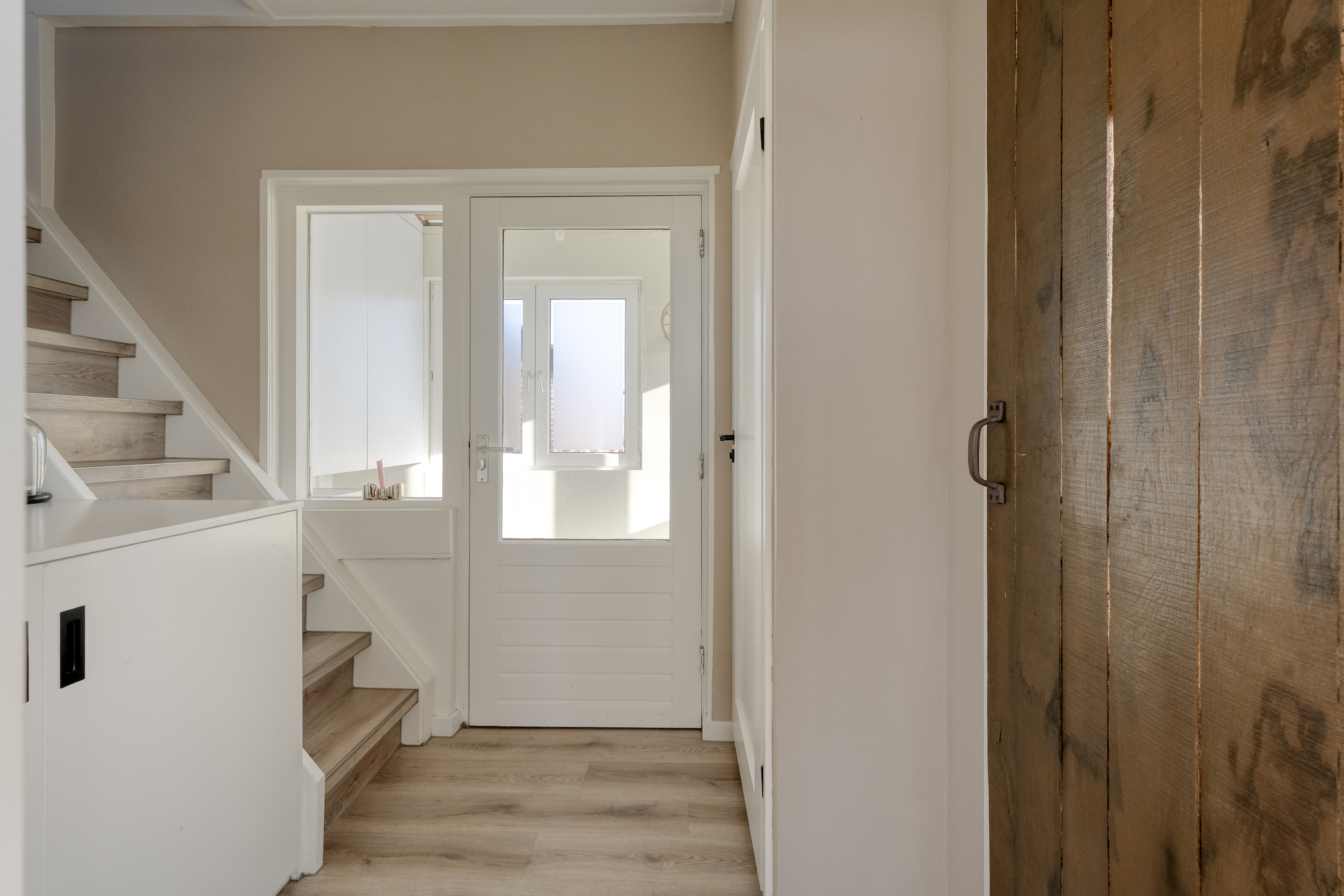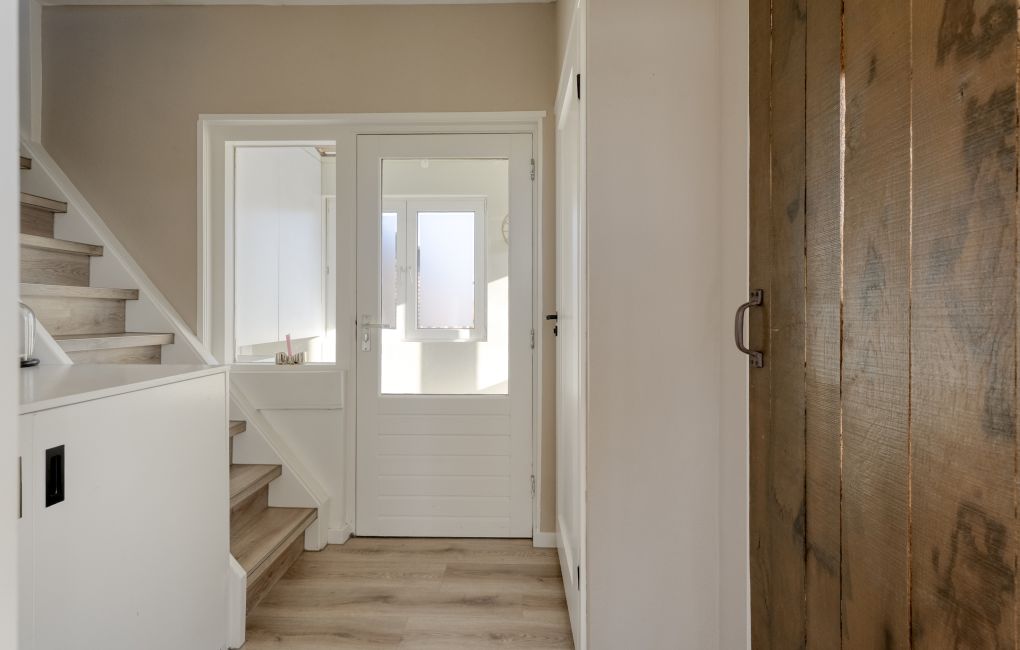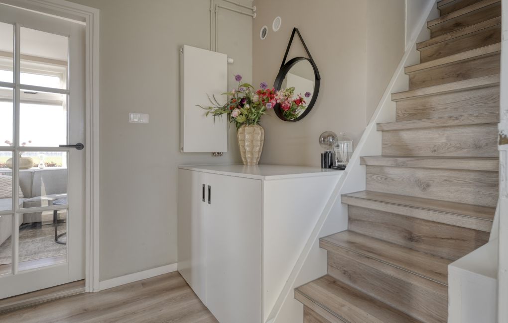 Via de aangebouwde entree met vaste kast betreed je de hal, waar zich het toilet en de trapopgang naar de verdieping bevinden. In de hal is op een praktische en nette manier een vaste kast gerealiseerd waarin de aansluiting voor de wasmachine en droger is weggewerkt. Hierdoor blijft alles mooi uit het zicht en oogt de ruimte rustig en verzorgd.