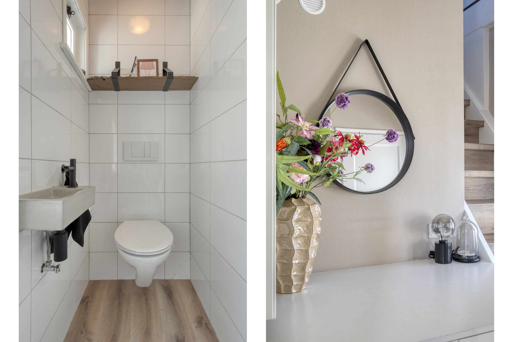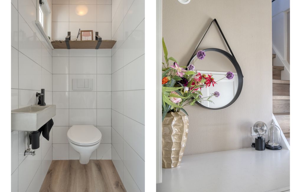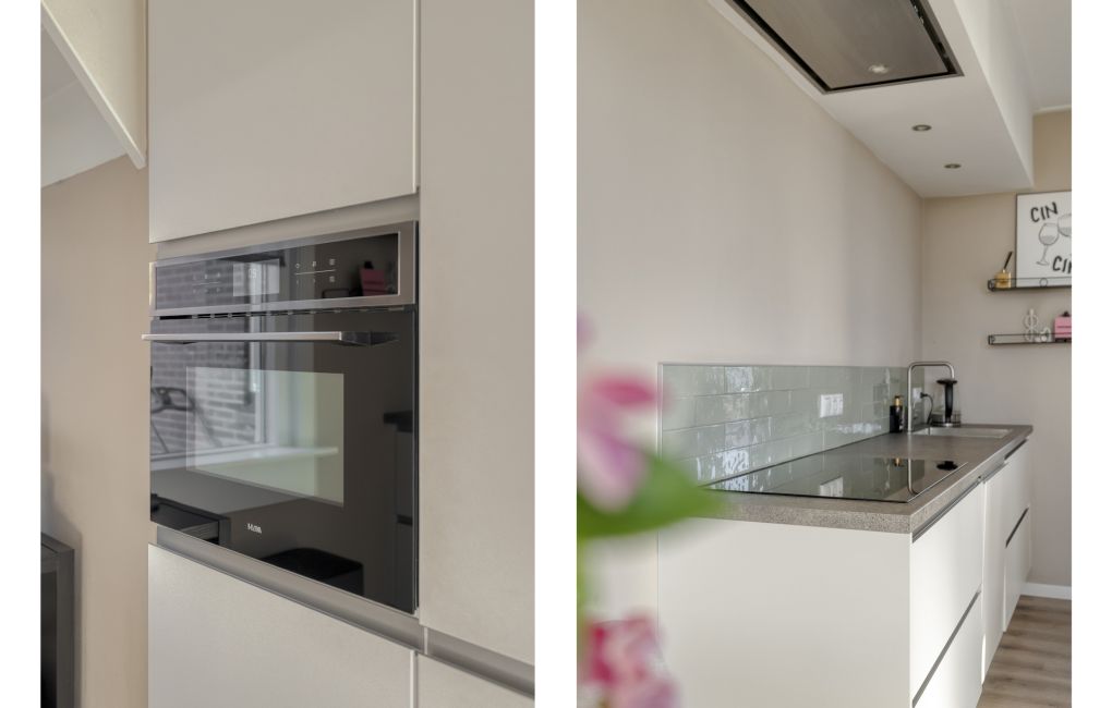 Verder is er in deze hal een afgesloten kast gecreëerd voor de cv-ketel. Hier is tevens plaats voor de kapstok, waardoor jassen en schoenen netjes opgeborgen kunnen worden en de entree overzichtelijk blijft.