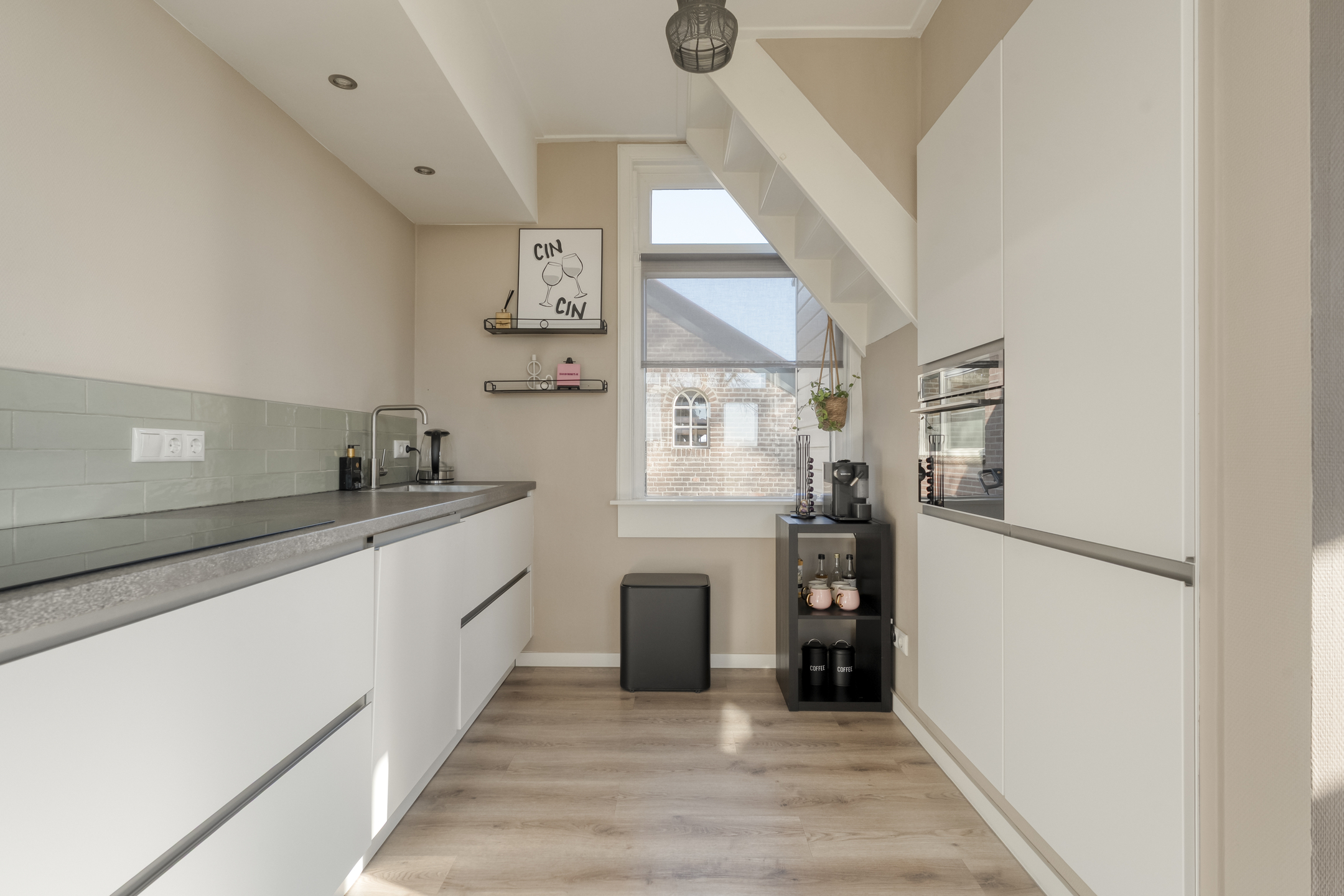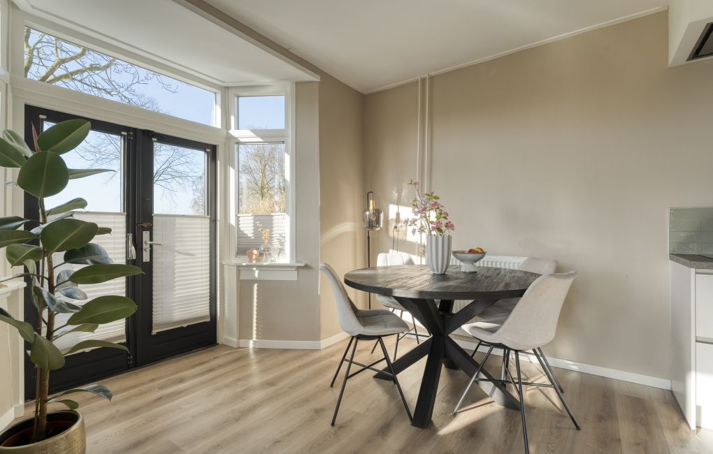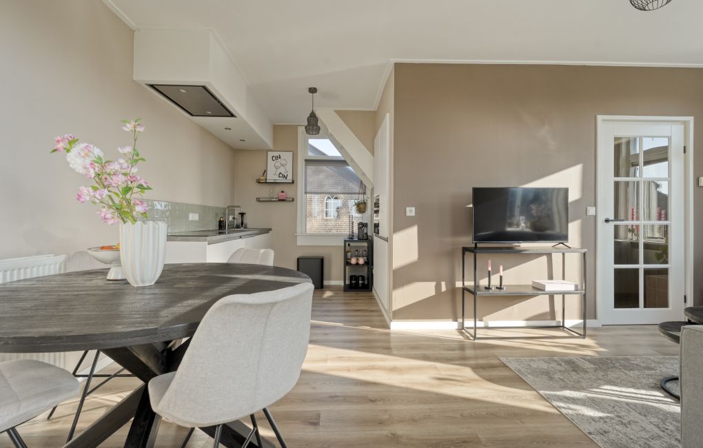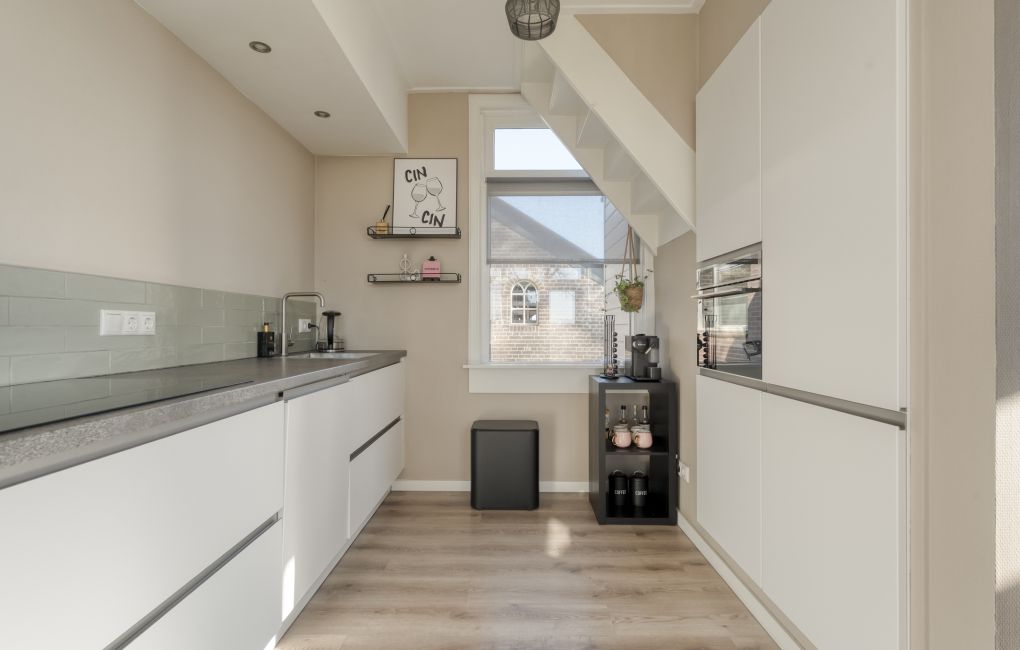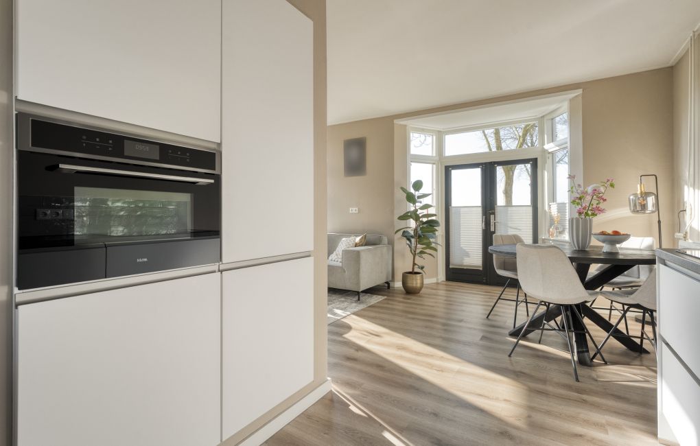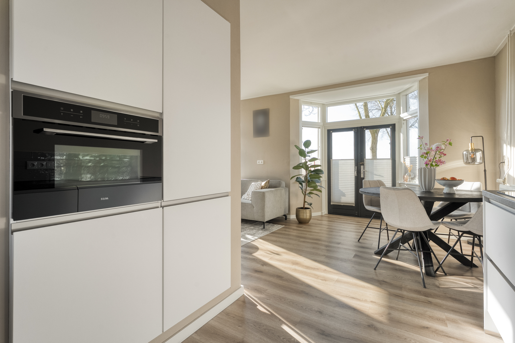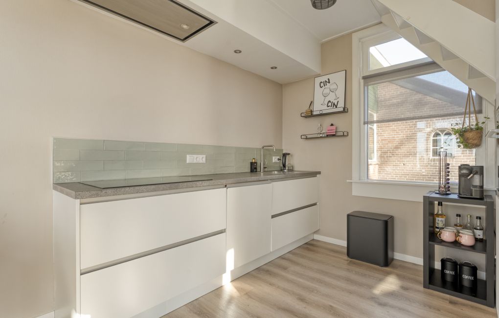 De woonkamer voelt direct warm en uitnodigend aan dankzij de vele lichtinval en de sfeervolle afwerking. De prachtige erker met openslaande deuren naar het terras zorgt ervoor dat binnen en buiten naadloos in elkaar overlopen. Aansluitend vind je de open keuken, vernieuwd in 2020 en van alle gemakken voorzien. Hier kook je met plezier dankzij de inductiekookplaat, combi-oven, vaatwasser, koelkast en ingebouwde afzuigkap. De gehele begane grond is afgewerkt met een sfeervolle PVC-vloer.