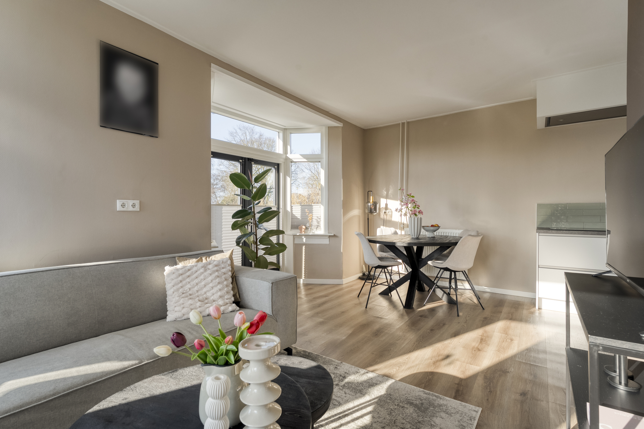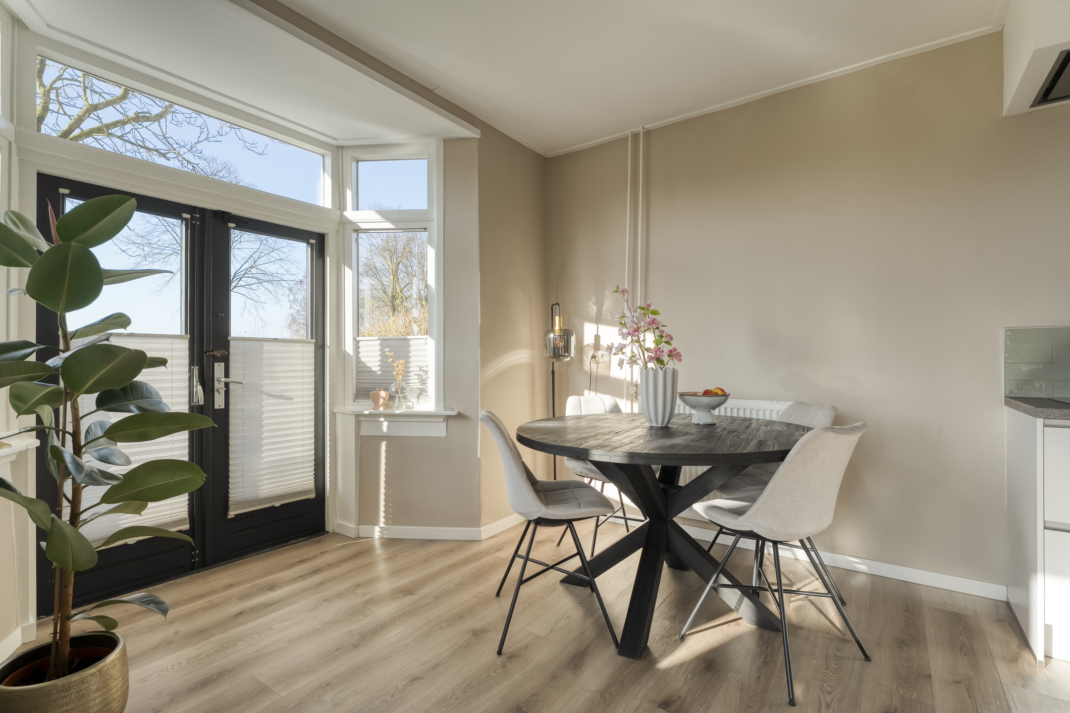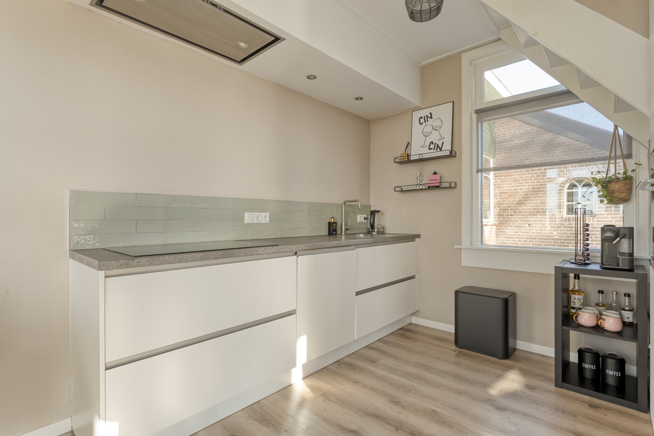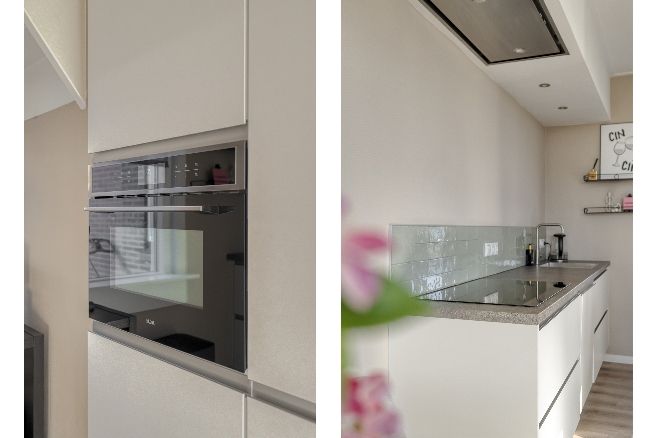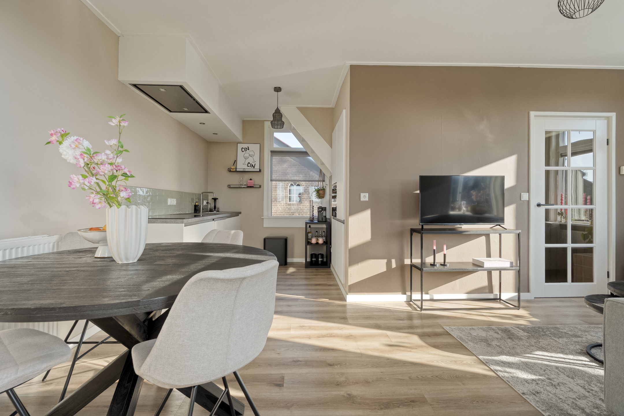 De woonkamer voelt direct warm en uitnodigend aan dankzij de vele lichtinval en de sfeervolle afwerking. De prachtige erker met openslaande deuren naar het terras zorgt ervoor dat binnen en buiten naadloos in elkaar overlopen. Aansluitend vind je de open keuken, vernieuwd in 2020 en van alle gemakken voorzien. Hier kook je met plezier dankzij de inductiekookplaat, combi-oven, vaatwasser, koelkast en ingebouwde afzuigkap. De gehele begane grond is afgewerkt met een sfeervolle PVC-vloer.