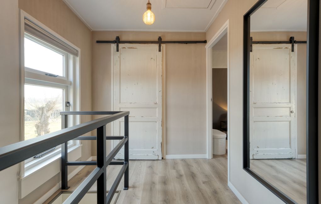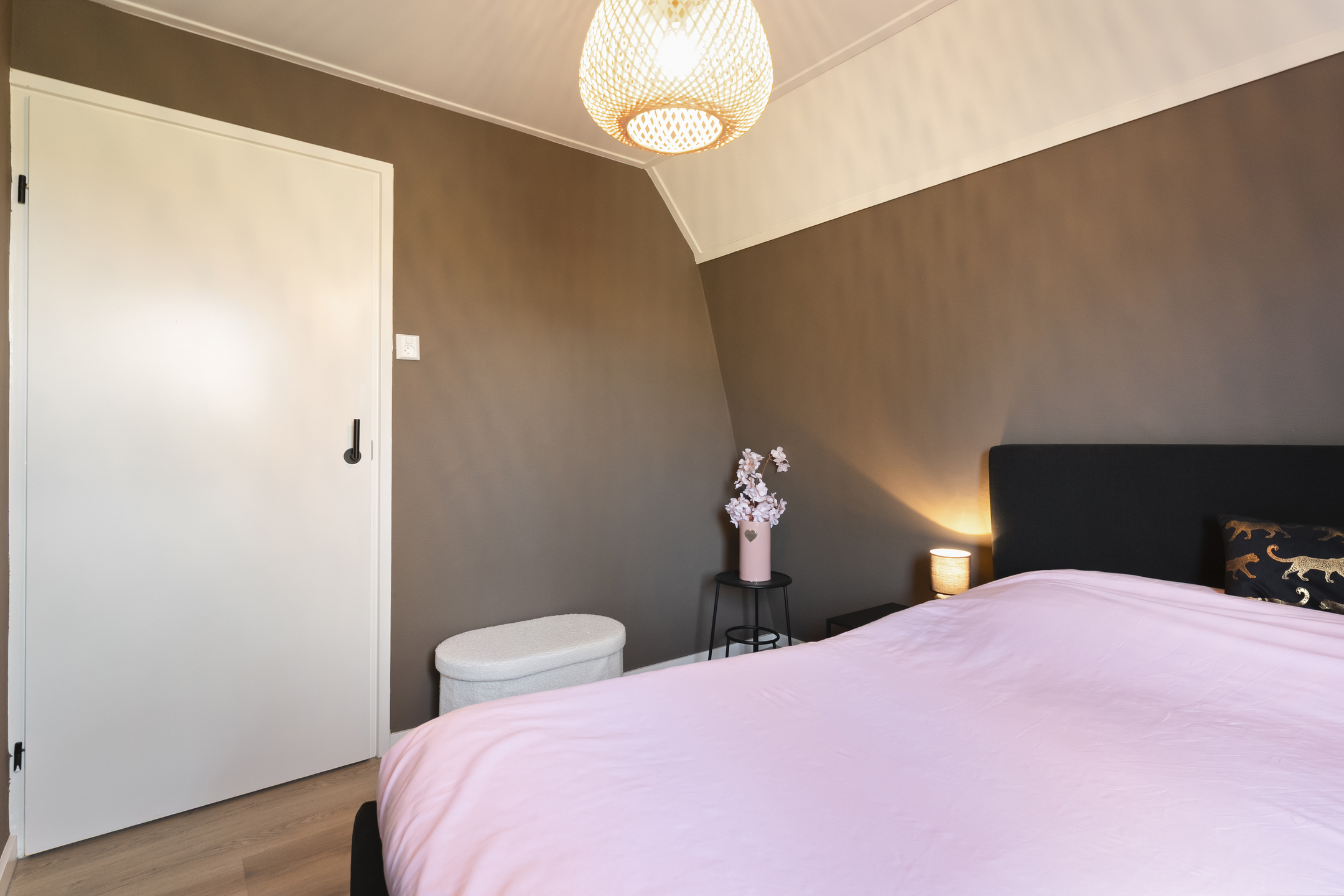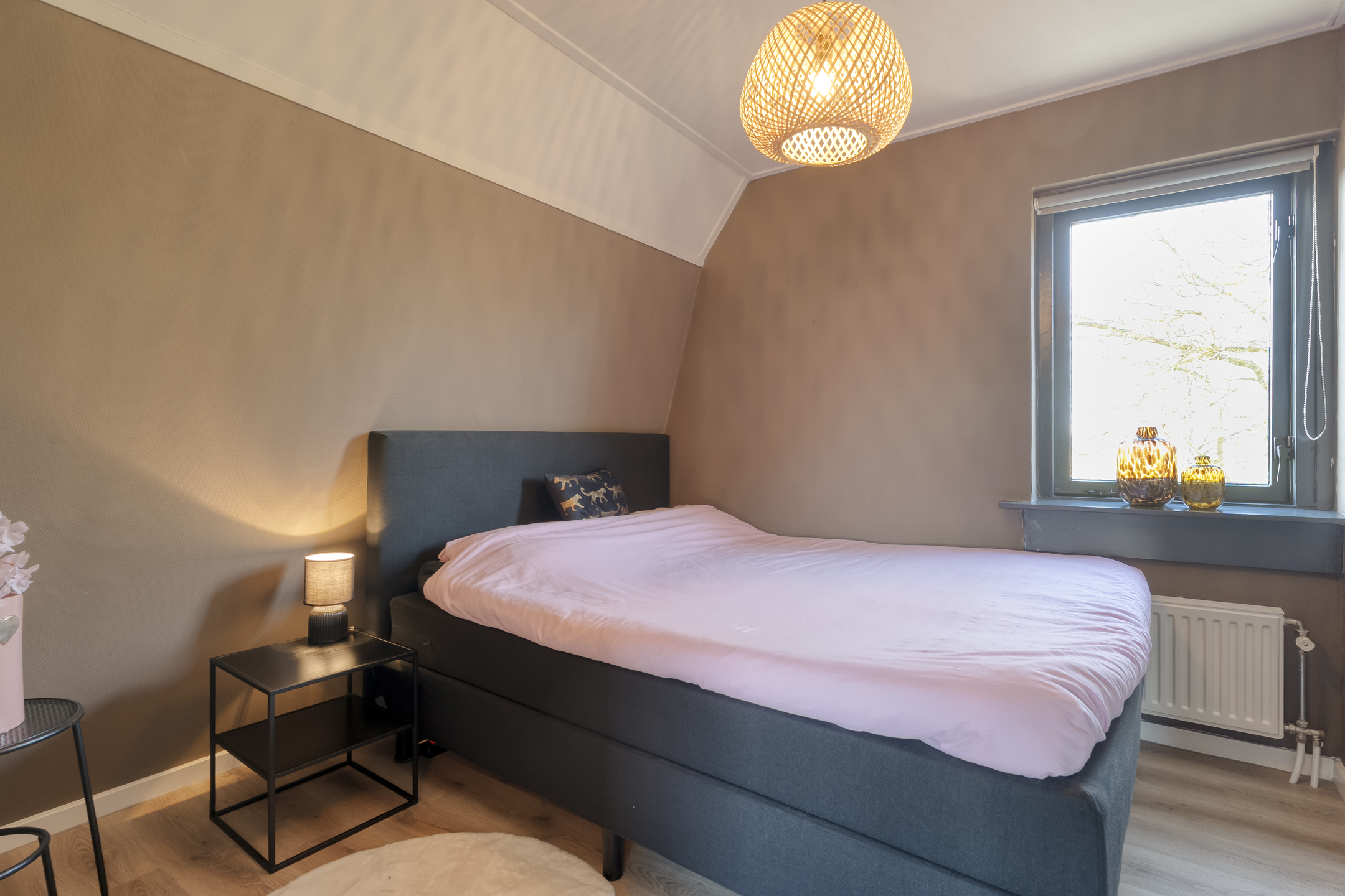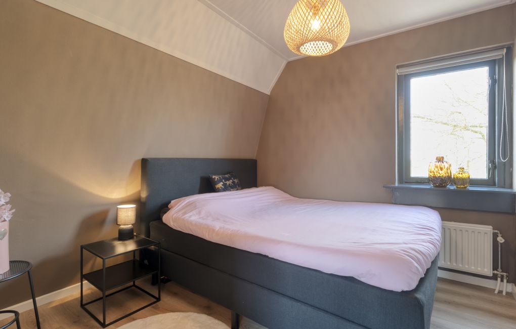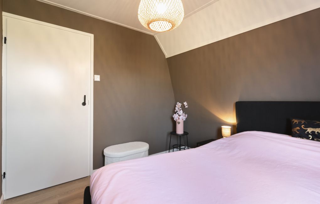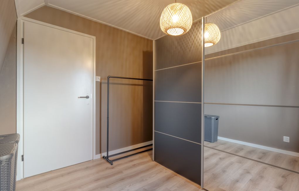 Op de verdieping kom je eerst op een verrassend ruime overloop die toegang geeft tot twee fijne slaapkamers. Ook hier loopt de PVC-vloer door en zorgen de warme kleuren voor een rustige en sfeervolle uitstraling. De badkamer is praktisch ingericht met een inloopdouche, toilet en wastafelmeubel.
