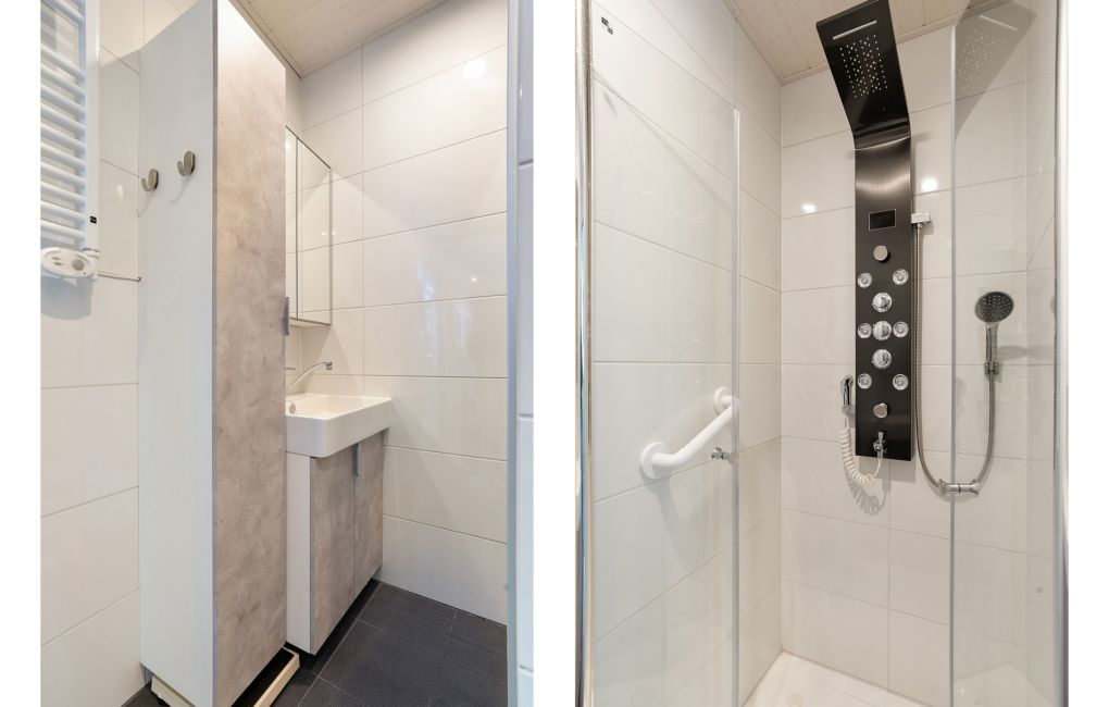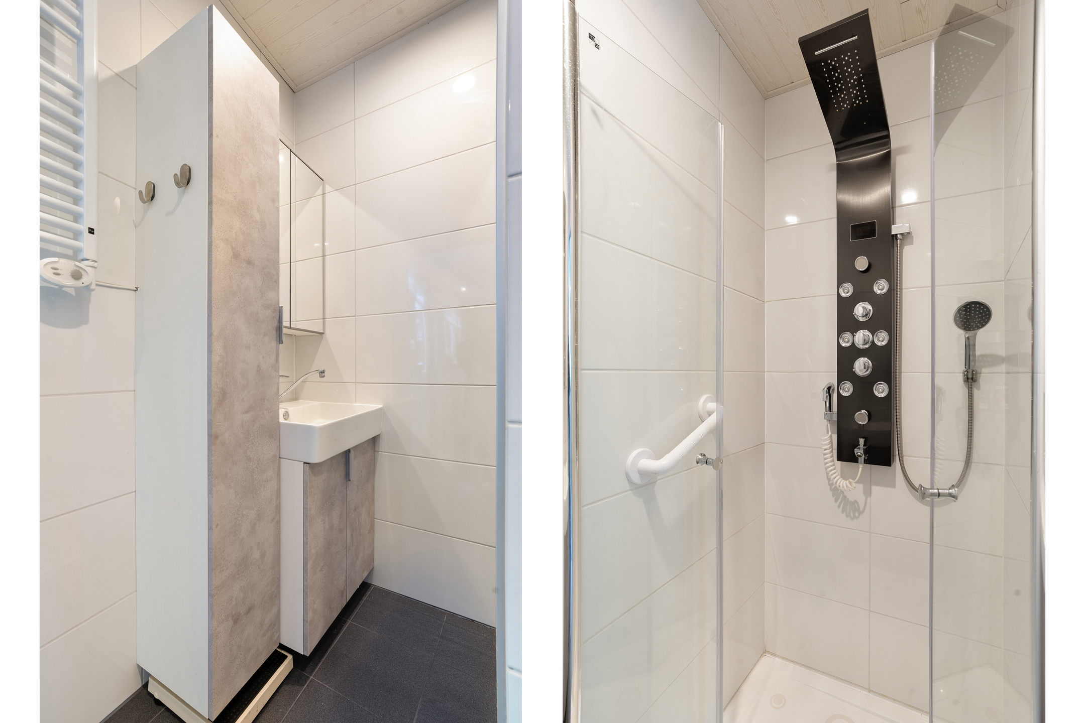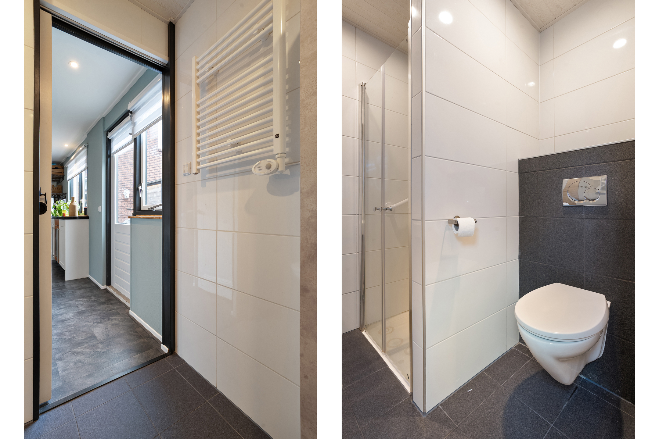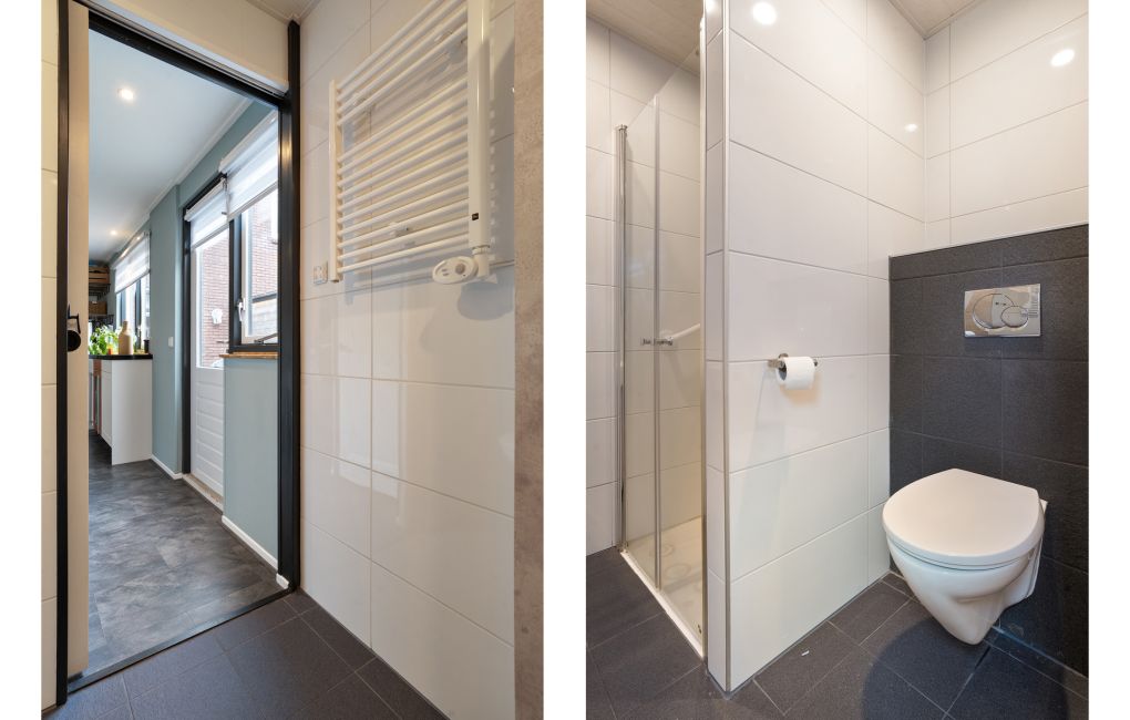 Achter de keuken is met een ruimtebesparende schuifdeur de toegang tot de moderne badkamer (2021), voorzien van toilet, wastafel en een royale doucheruimte met luxe regendouche.