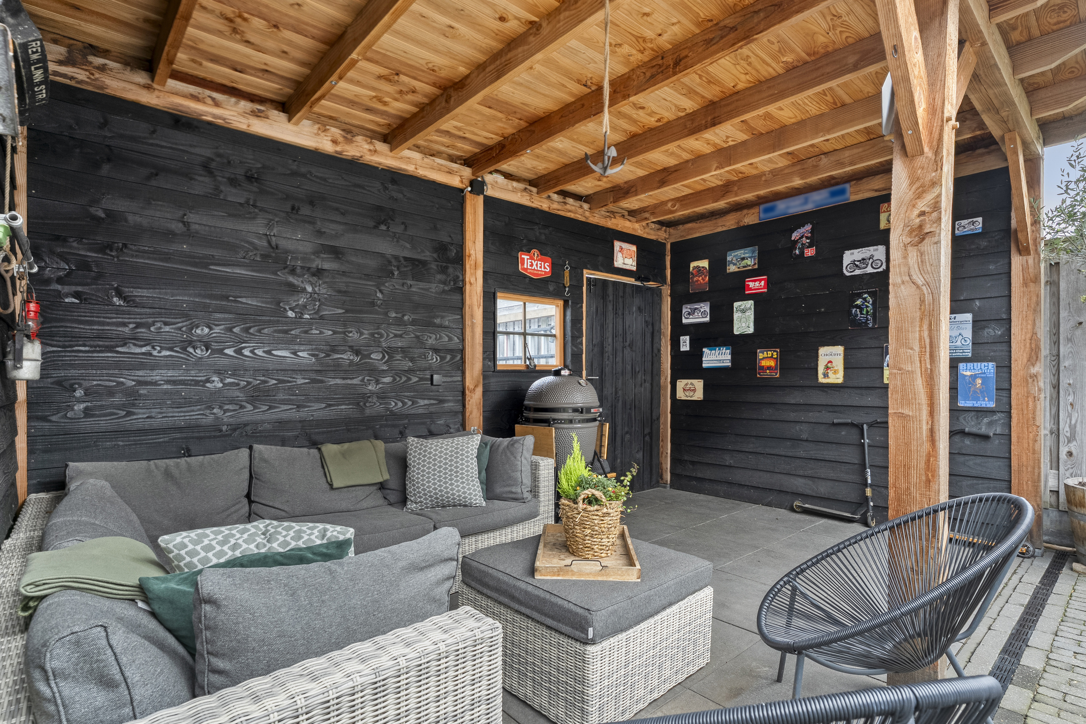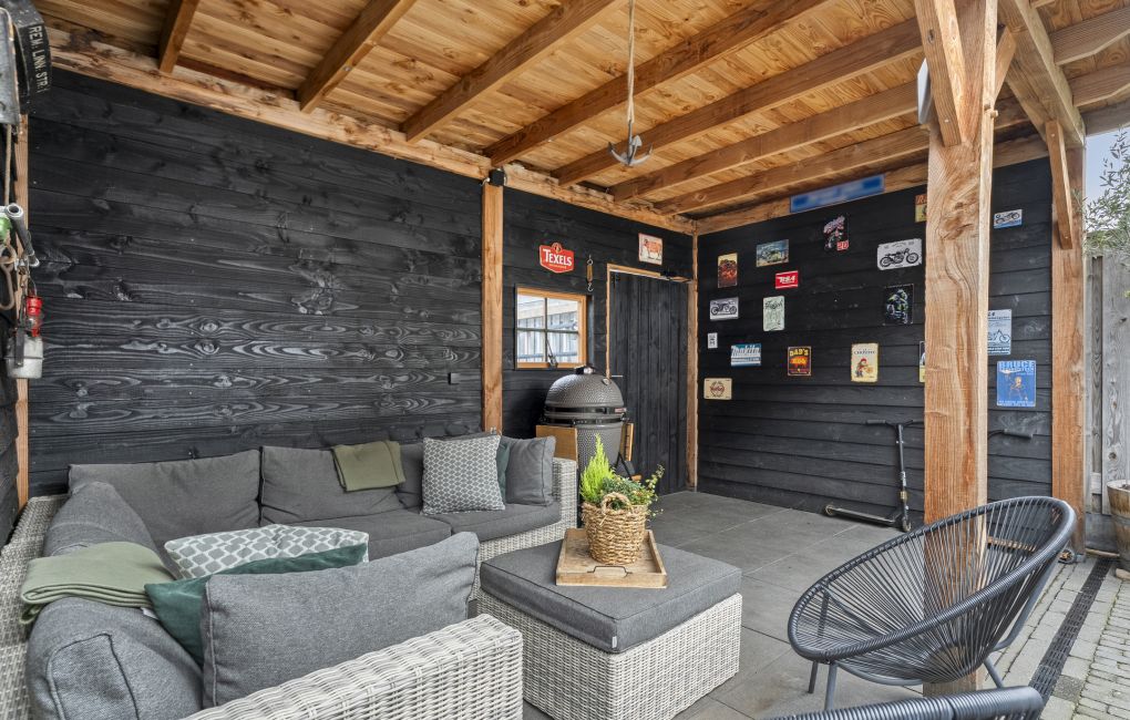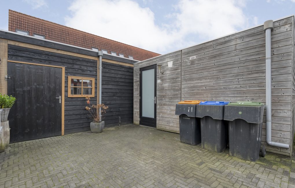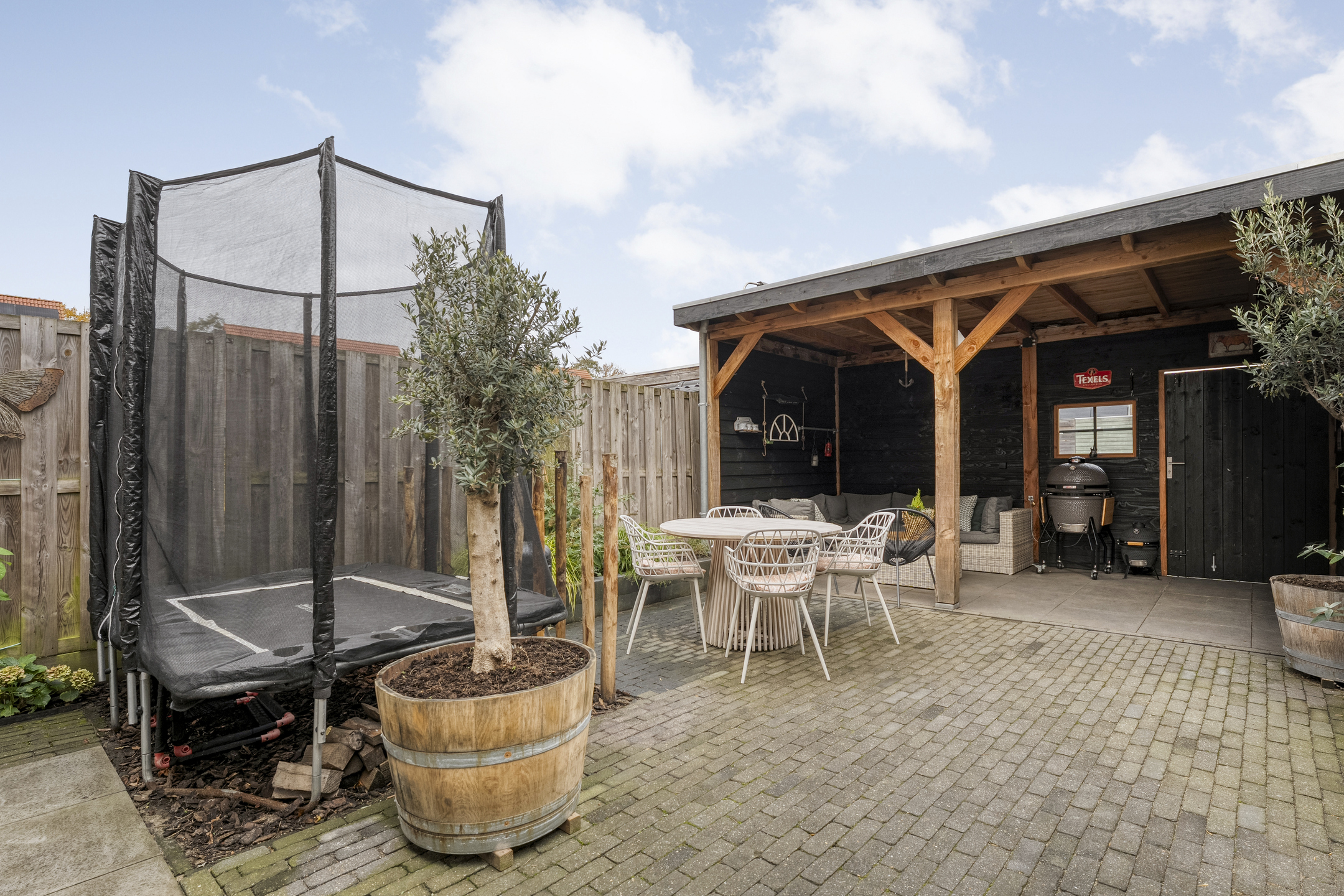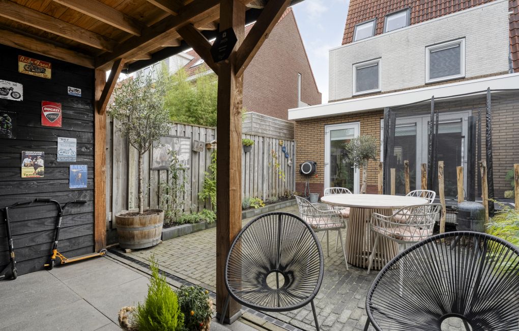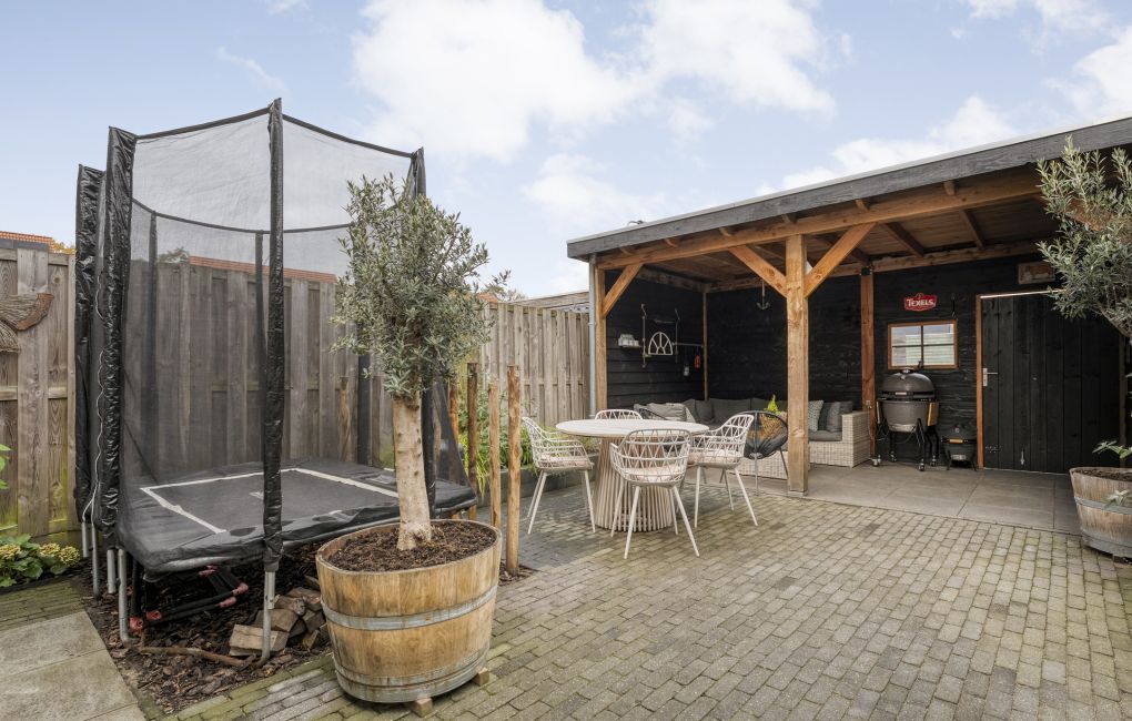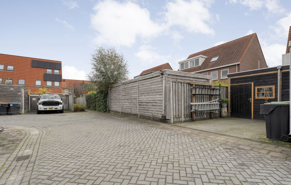 Achter de overkapping staat een houten berging. Perfect voor het opbergen van fietsen, tuingereedschap en andere spullen, en bovendien een praktische aanvulling op de buitenruimte. Direct naast de berging bevindt zich een praktische oprit, ideaal voor je eigen parkeergelegenheid voor de auto.