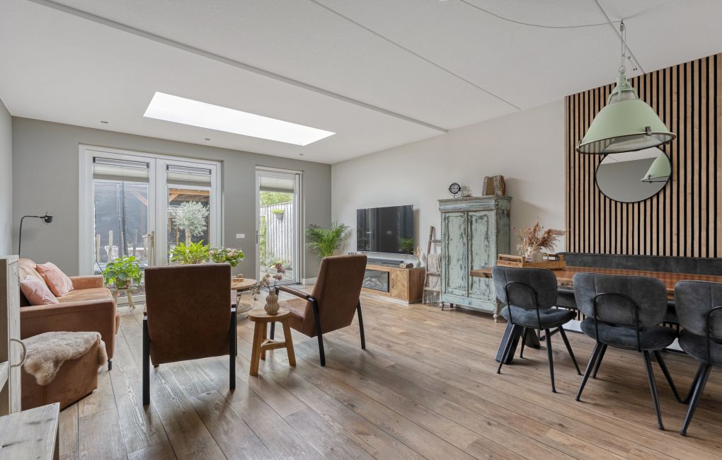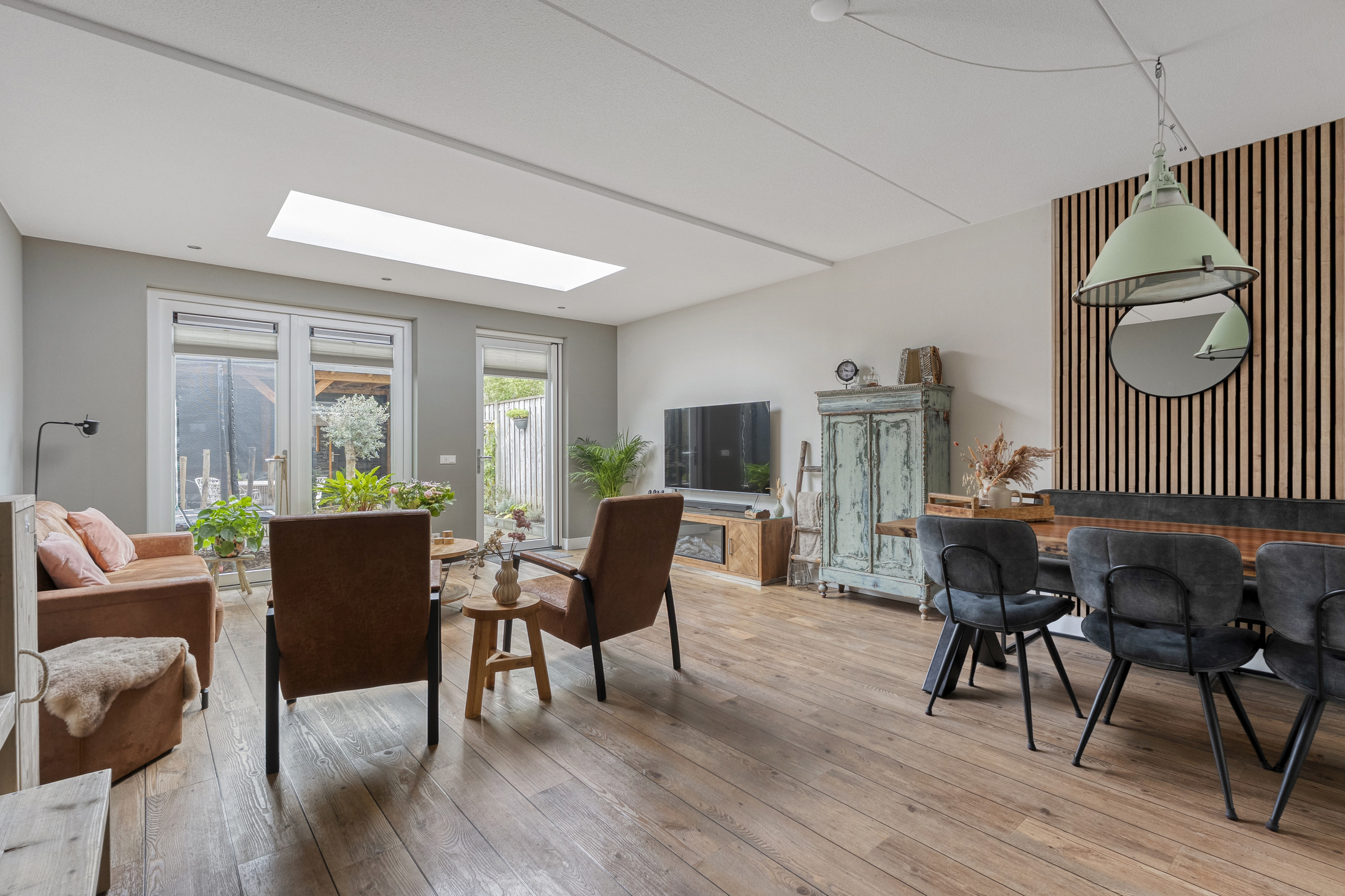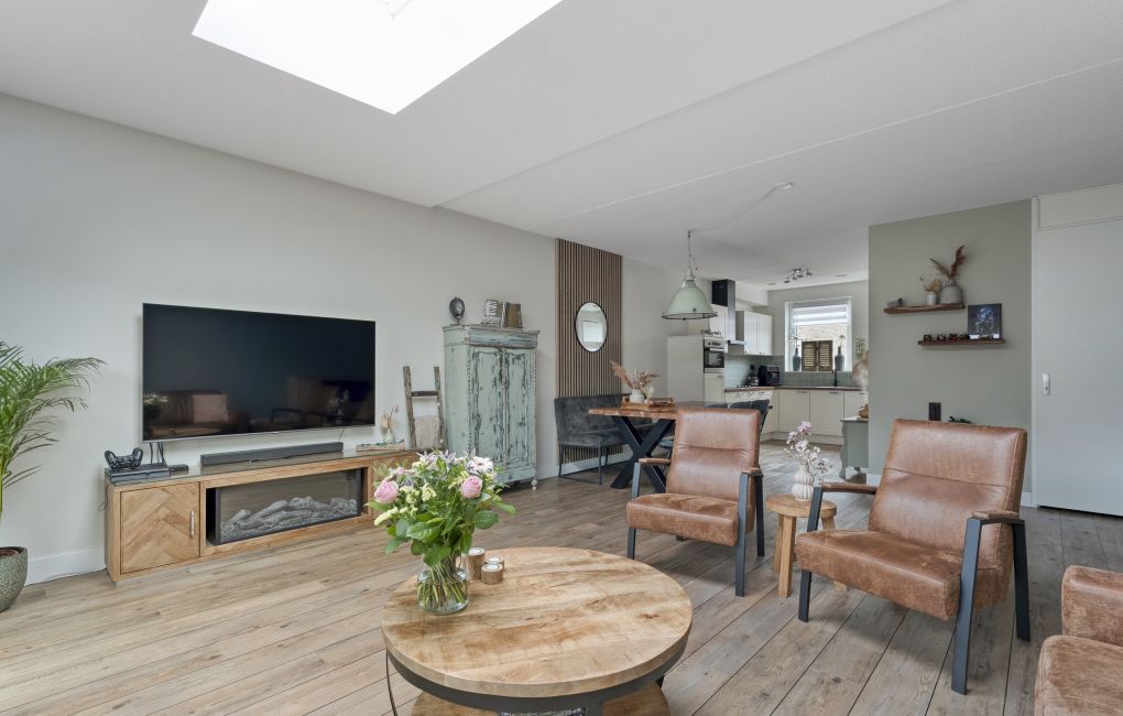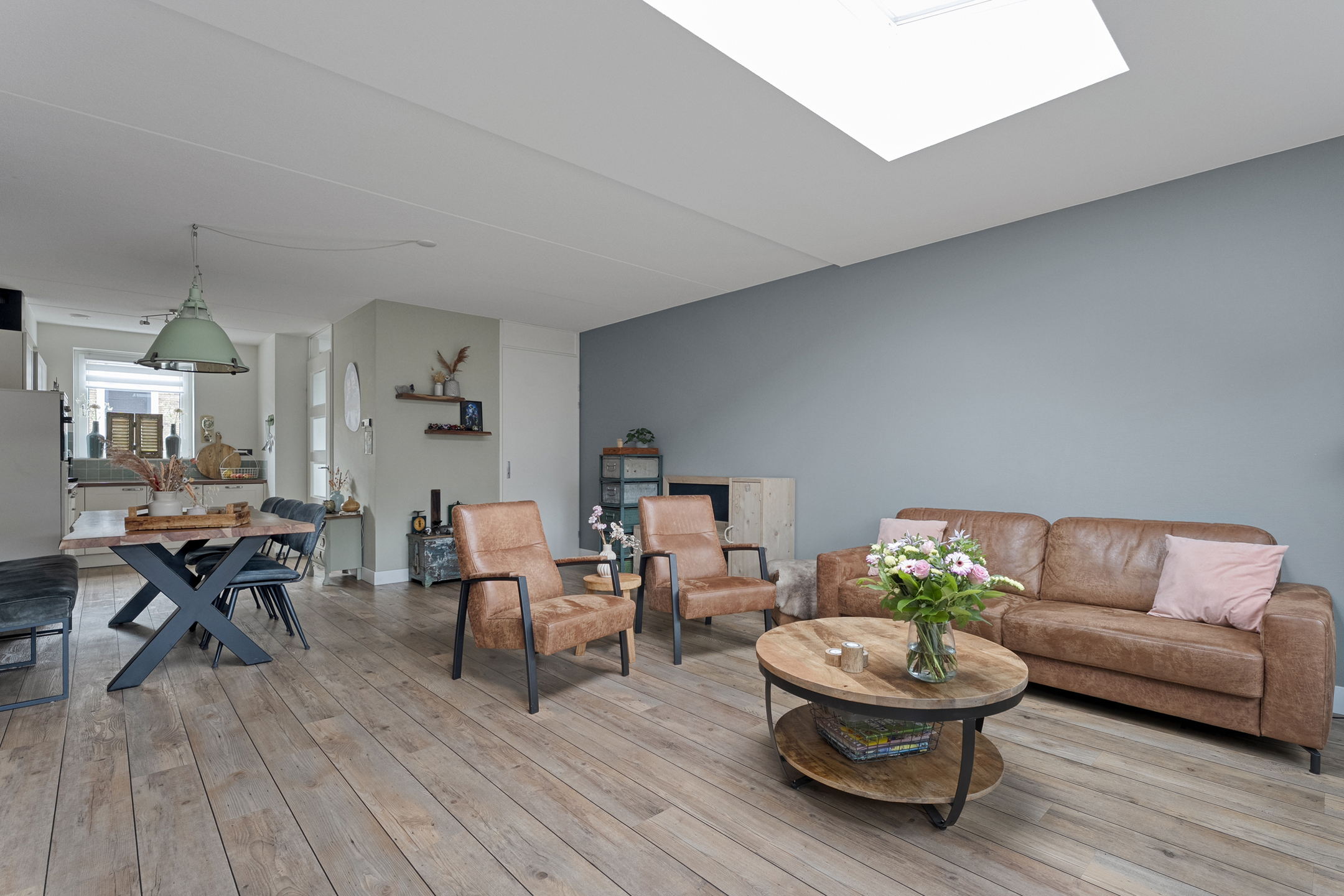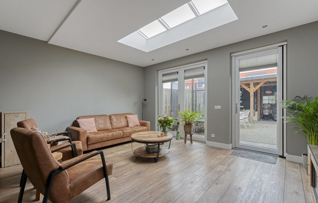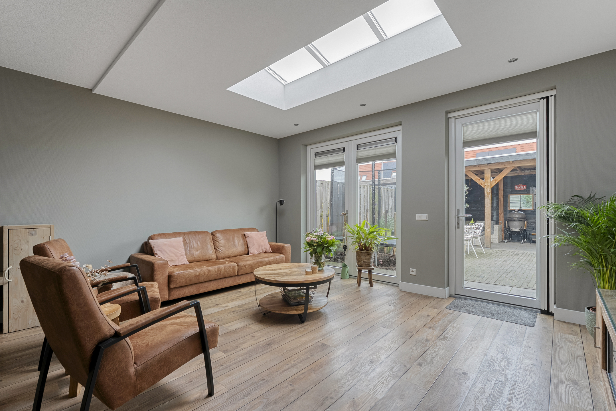 Via de lichte hal met trapopgang, handige trapkast en modern toilet kom je binnen in de living. De uitgebouwde woonkamer is voorzien van een prachtige lichtstraat, een zee aan ruimte en licht. De warme PVC-vloer geeft het geheel een sfeervolle uitstraling. De dubbele tuindeuren naar de achtertuin creëren een mooie verbinding tussen binnen en buiten.