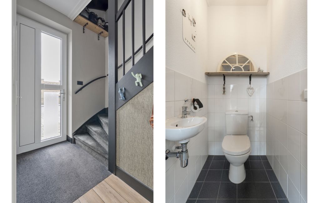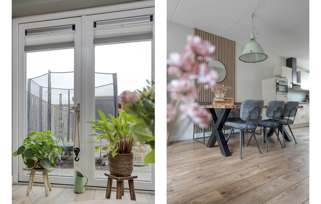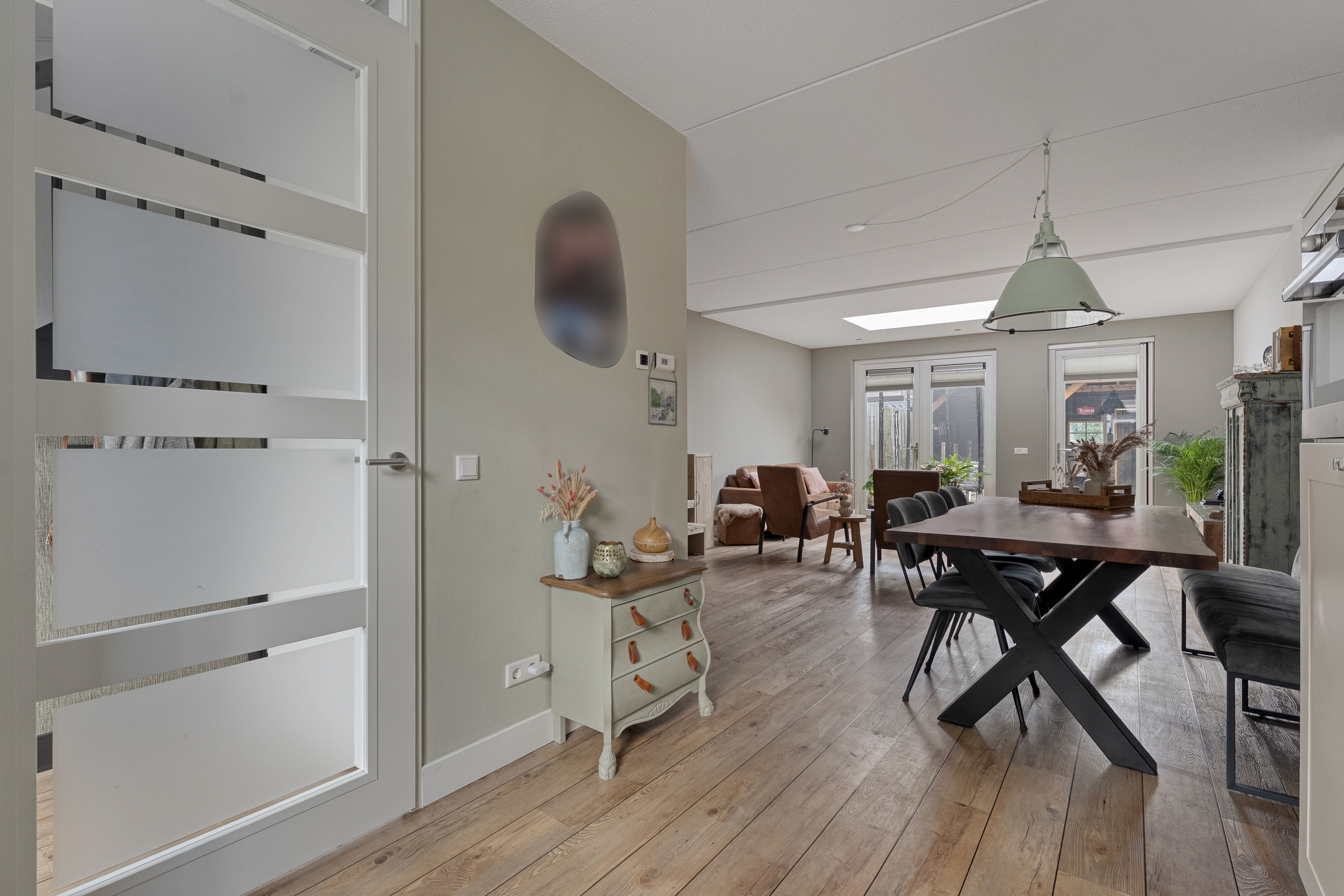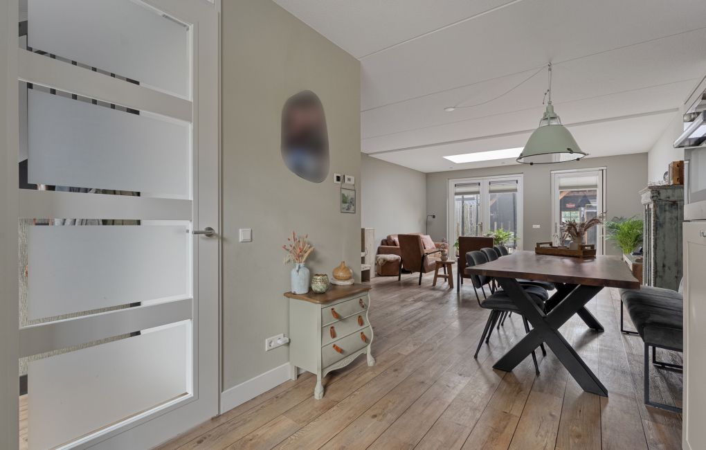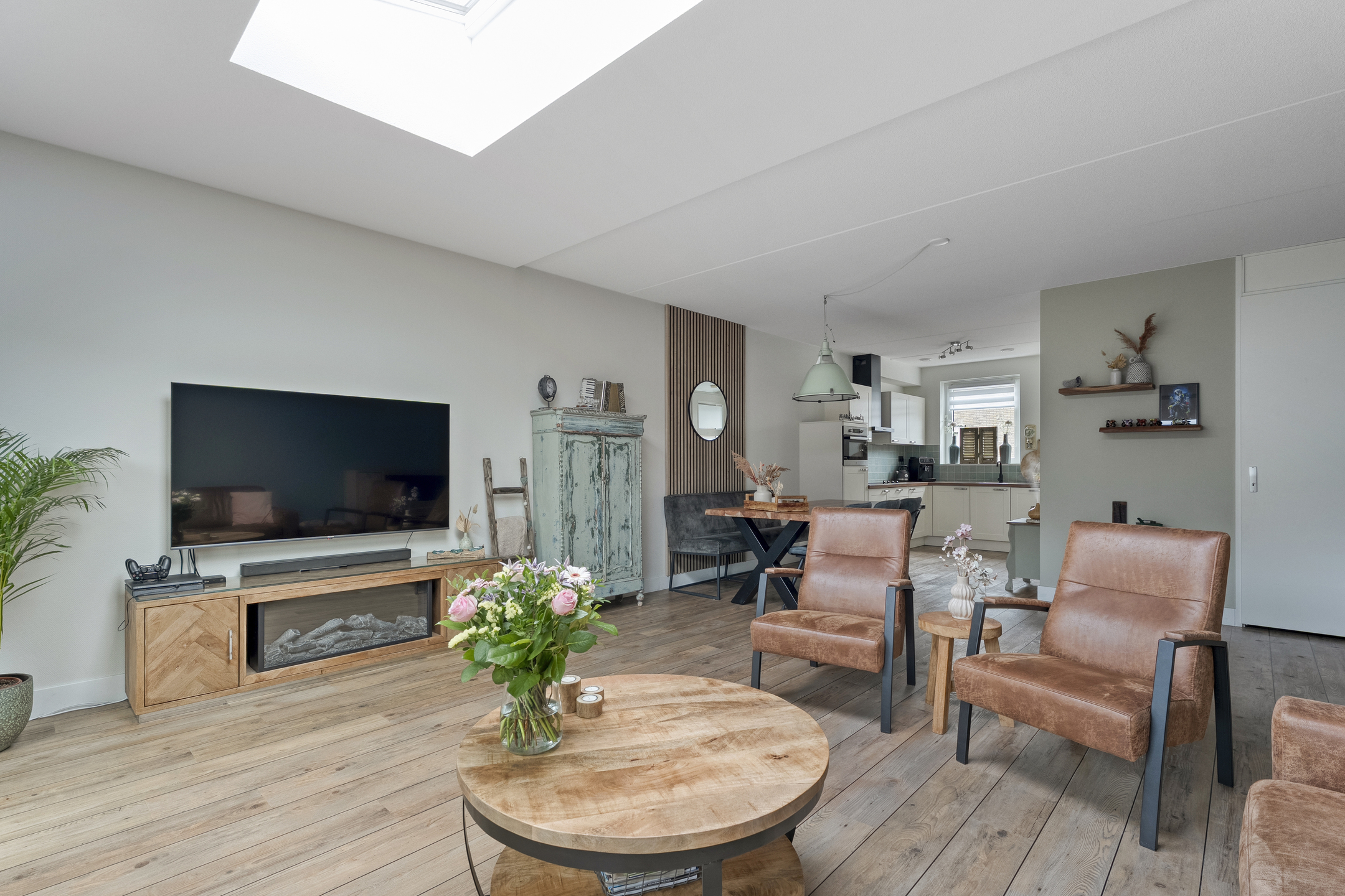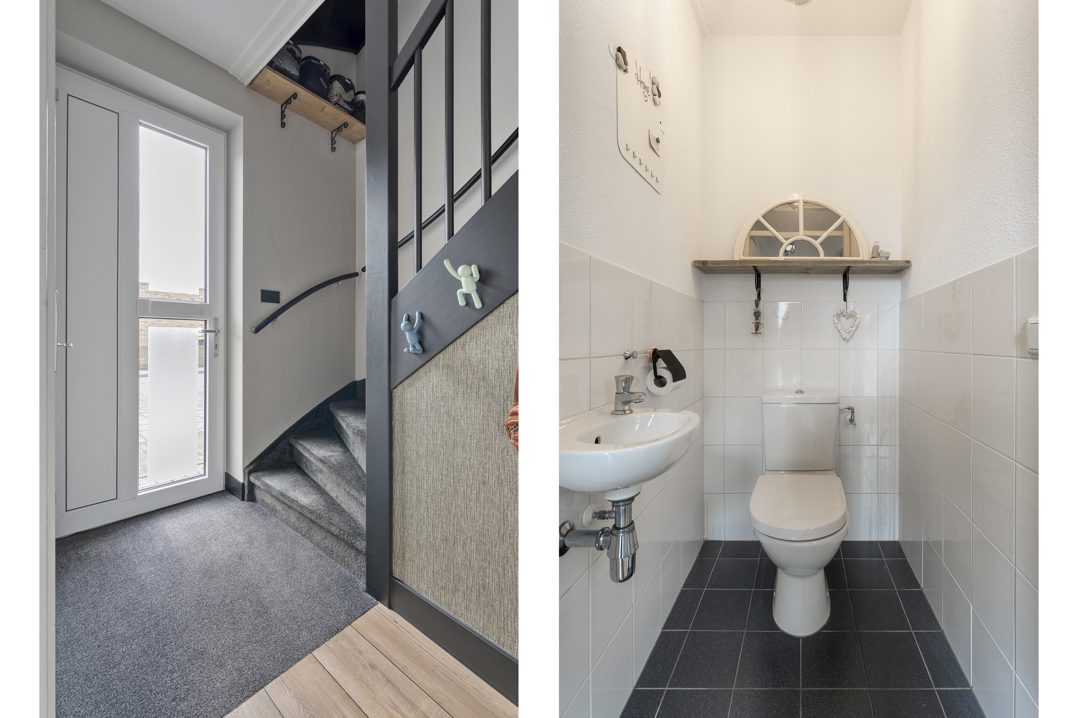 Via de lichte hal met trapopgang, handige trapkast en modern toilet kom je binnen in de living. De uitgebouwde woonkamer is voorzien van een prachtige lichtstraat, een zee aan ruimte en licht. De warme PVC-vloer geeft het geheel een sfeervolle uitstraling. De dubbele tuindeuren naar de achtertuin creëren een mooie verbinding tussen binnen en buiten.