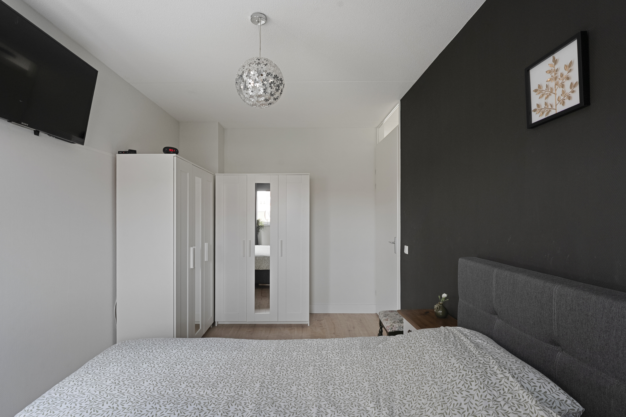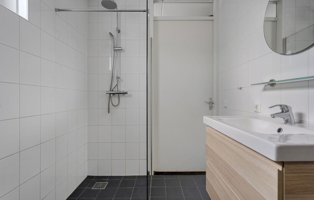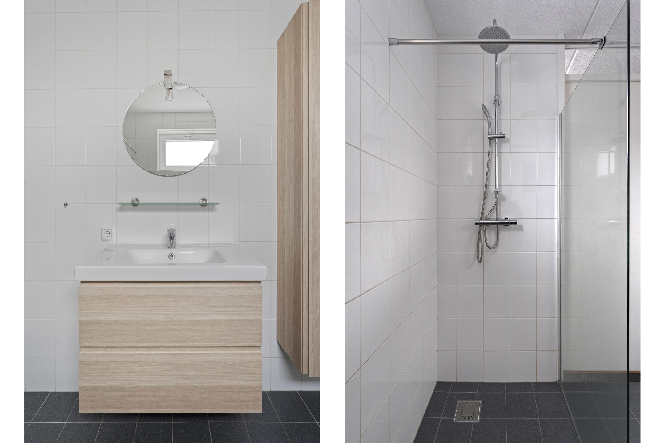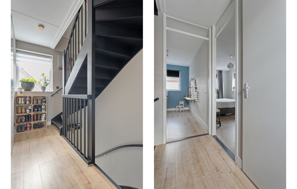 De trapopgang, bekleed met comfortabele vloerbedekking, leidt naar de twee slaapkamers en de badkamer. De slaapkamers zijn beide prettig van formaat en beschikken over voldoende daglicht dankzij de aanwezige raampartijen. De badkamer is stijlvol ingericht en uitgerust met een ruime inloopdouche, tweede toilet en een fraai wastafelmeubel met wastafel en bijpassende kolomkast voor extra opbergruimte. Een fijne plek om de dag fris te beginnen of ontspannen af te sluiten. Bovendien is deze verdieping, net als de begane grond, voorzien van vloerverwarming en -koeling!